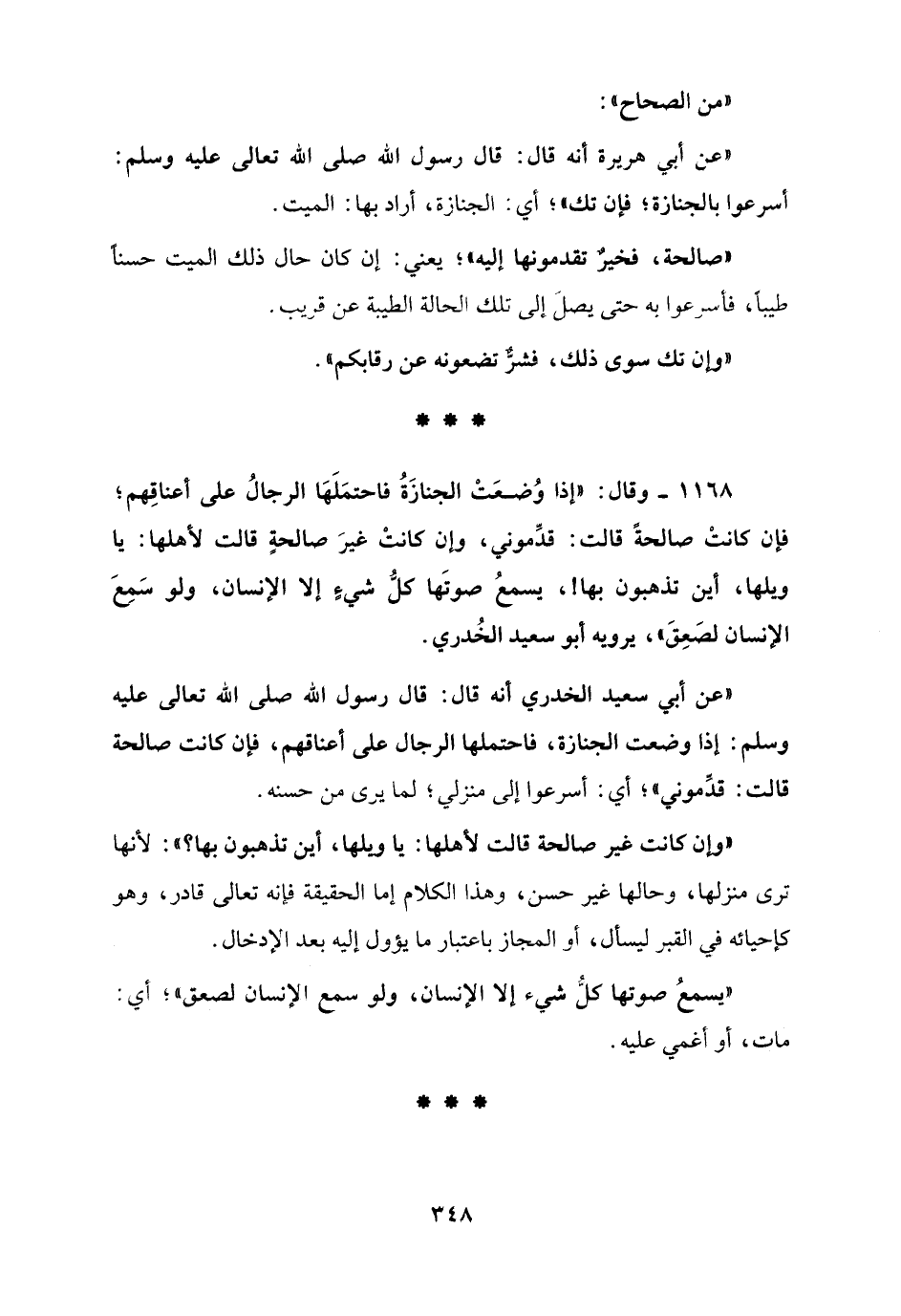 1168 - وقال: "إذا وُضعَتْ الجنازَةُ فاحتمَلَهَا الرجالُ على أعناقِهم؛ فإن كانتْ صالحةً قالت: قدِّموني، وإن كانت غيرَ صالحةٍ قالت لأهلها: يا ويلها، أين تذهبون بها!، يسمعُ صوتَها كل شيءٍ إلا الإنسان، ولو سَمعَ الإنسان لصَعِقَ"، يرويه أبو سعيد الخُدري.