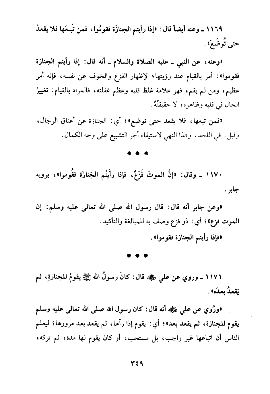 1171 - وروي عن علي - رضي الله عنه - قال: كانَ رسولُ الله - صلى الله عليه وسلم - يقومُ للجنازةِ، ثم يَقعدُ بعدَه".
