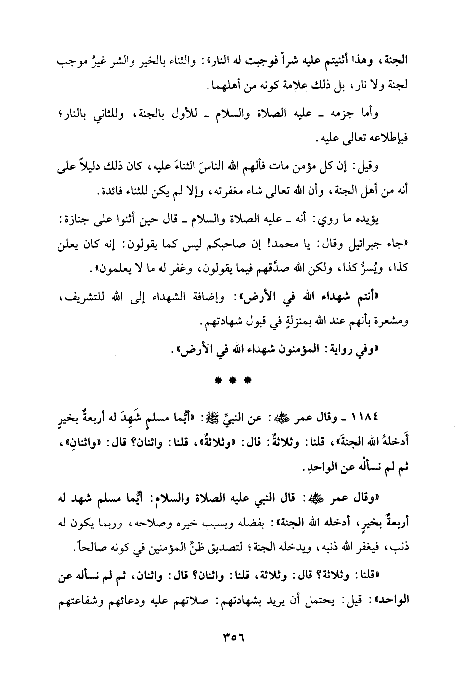 1184 - وقال عمر - رضي الله عنه -: عن النبيِّ - صلى الله عليه وسلم -: "أيُّما مسلم شَهِدَ له أربعةٌ بخيرٍ أَدخلهُ الله الجنةَ" قلنا: وثلاثةٌ: قال: "وثلاثة"، قلنا: واثنان؟ قال: "واثنانِ"، ثم لم نسألْه عن الواحدِ.