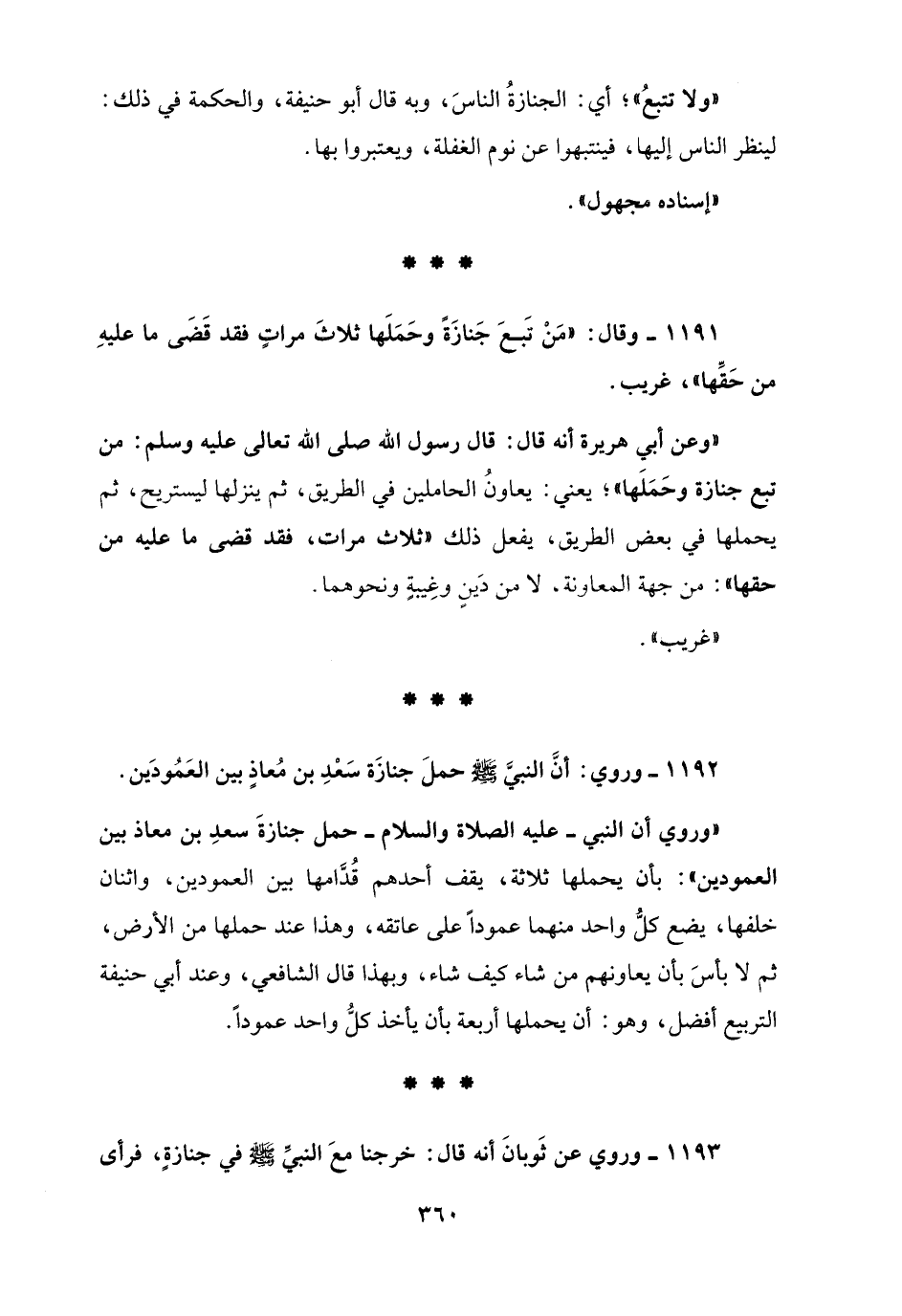 1191 - وقال: "مَنْ تَبعَ جَنازَةً وحَمَلَها ثلاثَ مراتٍ فقد قَضَى ما عليهِ من حَقِّها"، غريب.