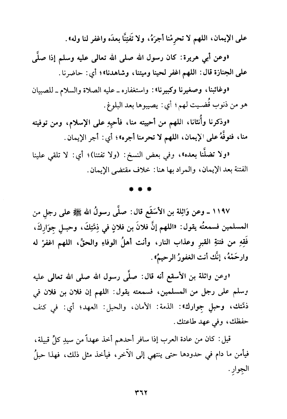 "وعن واثلة بن الأسقع أنه قال: صلَّى رسول الله صلى الله تعالى عليه وسلم على رجل من المسلمين، فسمعته يقول: اللهم إن فلان بن فلان في ذمَّتك، وحبلِ جِوارك": الذمة: الأمان، والحبل: العهد؛ أي: في كنف حفظك، وفي عهد طاعتك.