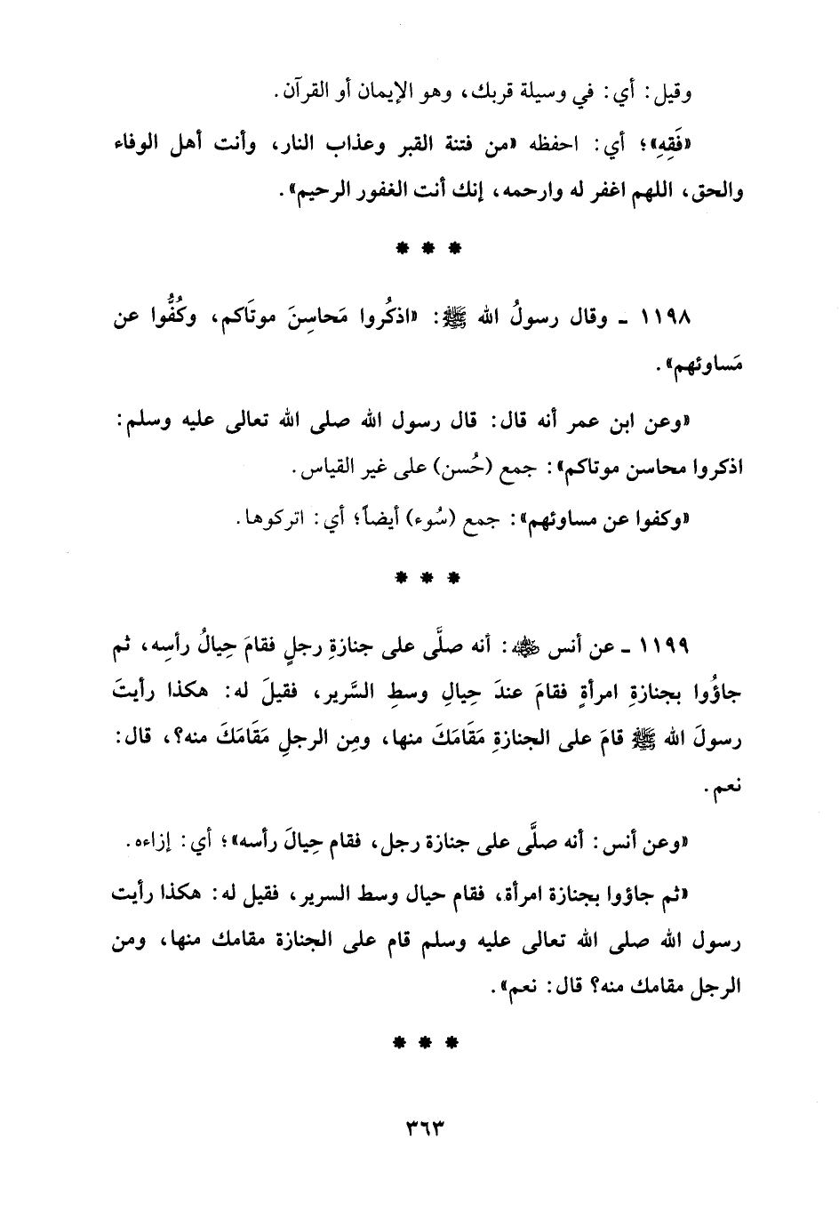 1199 - عن أنس - رضي الله عنه -: أنه صلَّى على جنازةِ رجلٍ فقامَ حِيال رأسِه، ثم جاؤوا بجنازةِ امرأةٍ فقامَ عندَ حِيالِ وسطِ السَّرير، فقيلَ له: هكذا رأيتَ رسولَ الله - صلى الله عليه وسلم - قامَ على الجنازةِ مَقَامَكَ منها، ومِن الرجلِ مَقَامَكَ منه؟، قال: نعم.