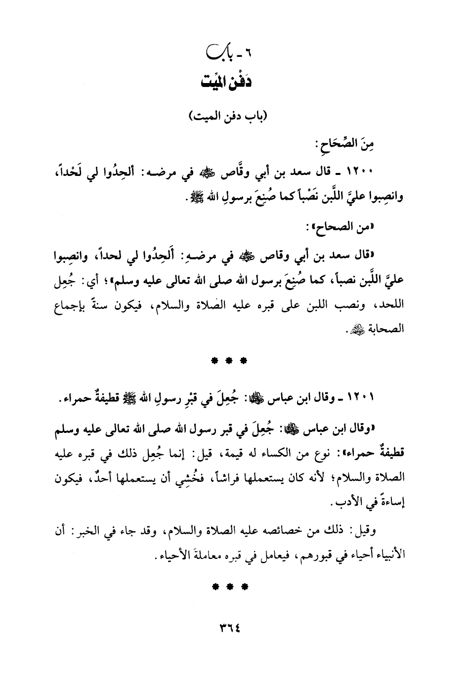 1200 - قال سعد بن أبي وقَّاص - رضي الله عنه - في مرضه: ألحِدُوا لي لَحْداً، وانصِبوا عليَّ اللَّبن نصباً كما صُنِعَ برسولِ الله - صلى الله عليه وسلم -.