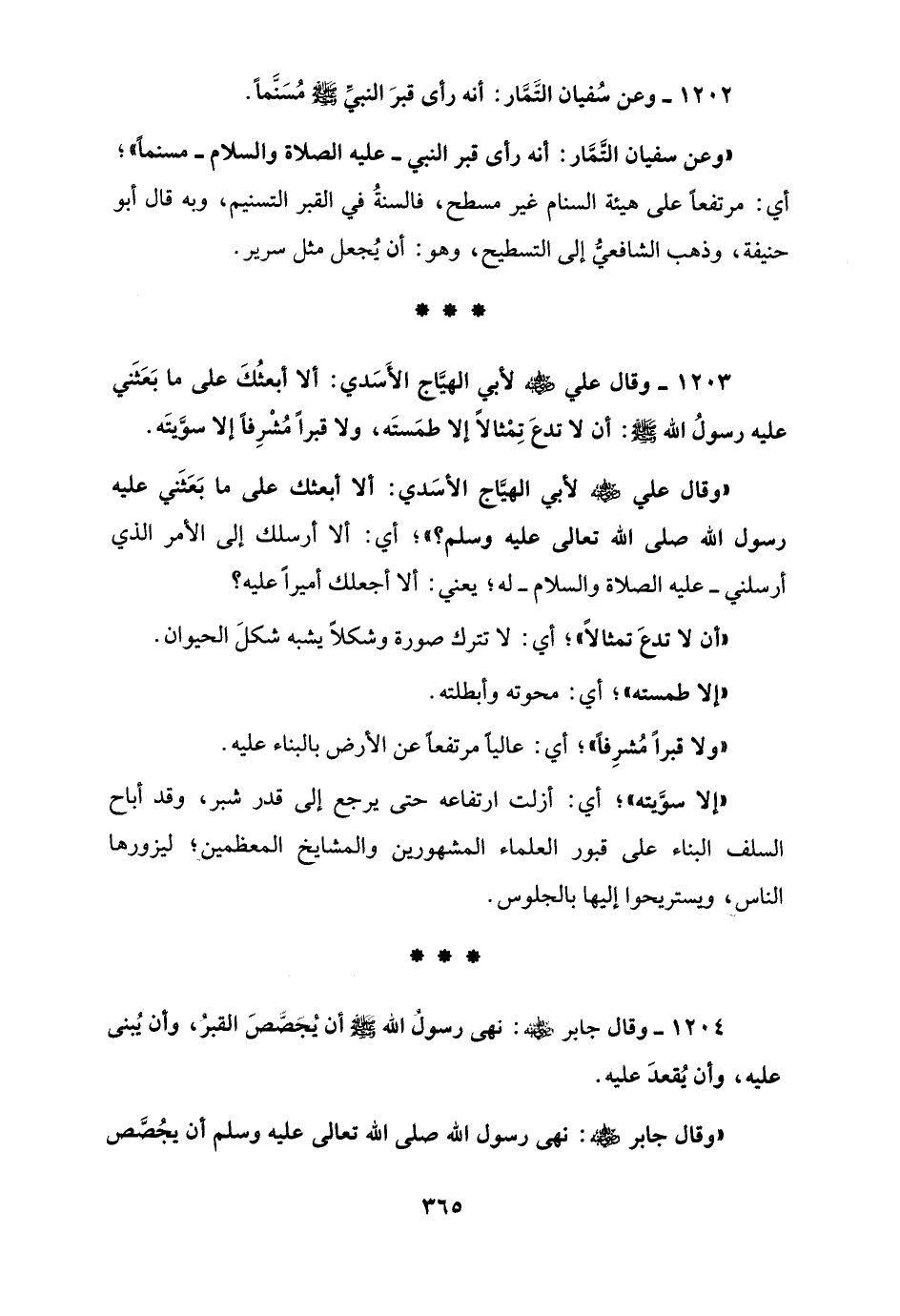 1203 - وقال علي - رضي الله عنه - لأبي الهيَّاج الأَسَدي: ألا أبعثُكَ على ما بَعَثَني عليه رسولُ الله - صلى الله عليه وسلم -: أن لا تدع تِمثالاً إلا طمستَه، ولا قبراً مُشْرِفاً إلا سوَّيتَه.