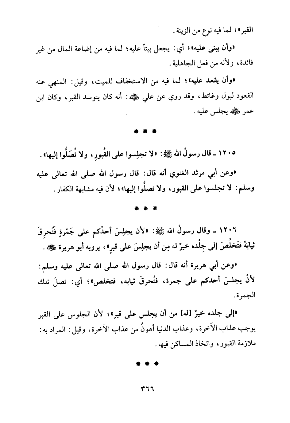 1206 - وقال رسولُ الله - صلى الله عليه وسلم -: "لأن يجلِسَ أحدُكم على جَمْرةٍ فتحرِقَ ثيابَهُ فتَخلُصَ إلى جِلْده خير له مِن أن يجلِسَ على قبرٍ"، يرويه أبو هريرة - رضي الله عنه -.