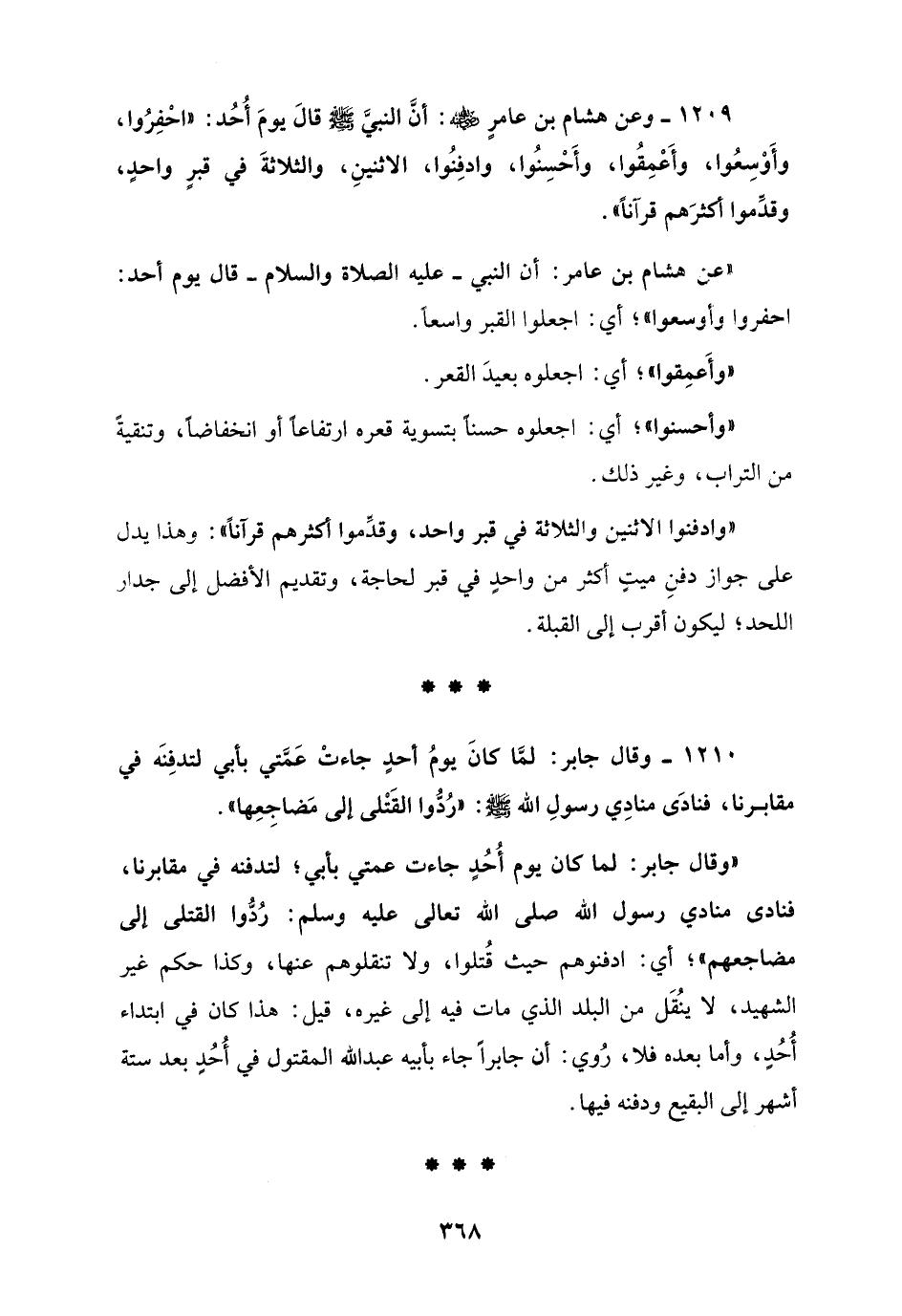 1209 - وعن هشام بن عامرٍ - رضي الله عنه -: أنَّ النبي - صلى الله عليه وسلم - قالَ يومَ أُحُد: "احْفِرُوا، وأَوْسِعُوا، وأَعْمِقُوا، وأَحْسِنُوا، وادفِنُوا، الاثنينِ، والثلاثةَ في قبرٍ واحدٍ، وقدِّموا أكثرَهم قرآناً".
