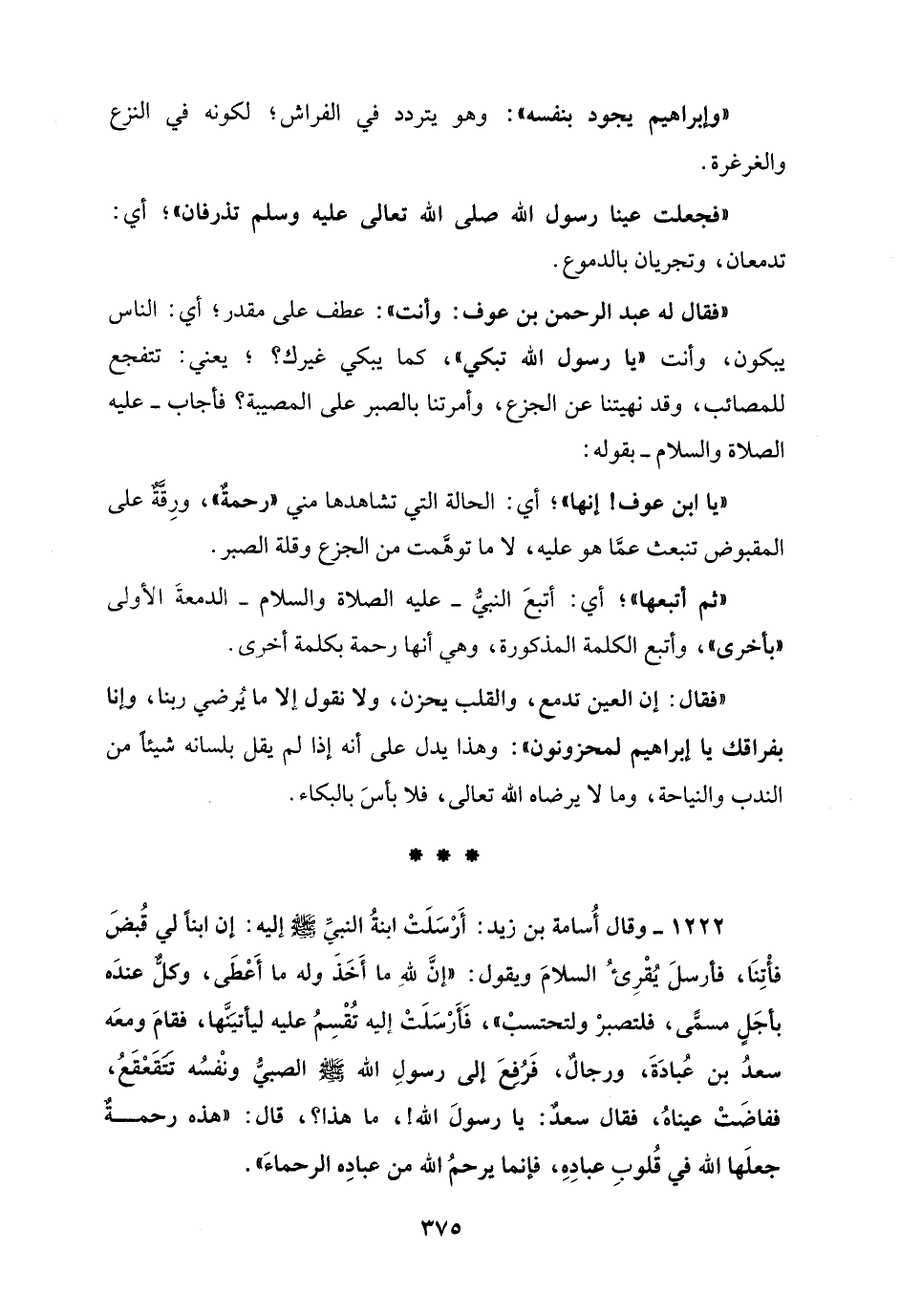 1222 - وقال أُسامة بن زيد: أَرْسَلَتْ ابنةُ النبيِّ - صلى الله عليه وسلم - إليه: إن ابنًا لي قُبضَ فأْتِنَا، فأرسلَ يُقْرِئُ السلامَ ويقول: "إنَّ للهِ ما أَخَذَ وله ما أَعْطَى، وكلُّ عندَه بأجَلٍ مسمًّى، فلتصبرْ ولتحتسبْ"، فَأَرْسَلَتْ إليه تُقْسِمُ عليه ليأتينها، فقامَ ومعَه سعدُ بن عُبادَةَ، ورجالٌ، فَرُفع إلى رسولِ الله - صلى الله عليه وسلم - الصبيُّ ونْفسُه تتَقَعْقَعُ، ففاضَتْ عيناهُ، فقال سعدٌ: يا رسولَ الله!، ما هذا؟، قال: "هذه رحمةٌ جعلَها الله في قُلوبِ عبادِهِ، فإنما يرحمُ الله من عبادِه الرحماءَ".