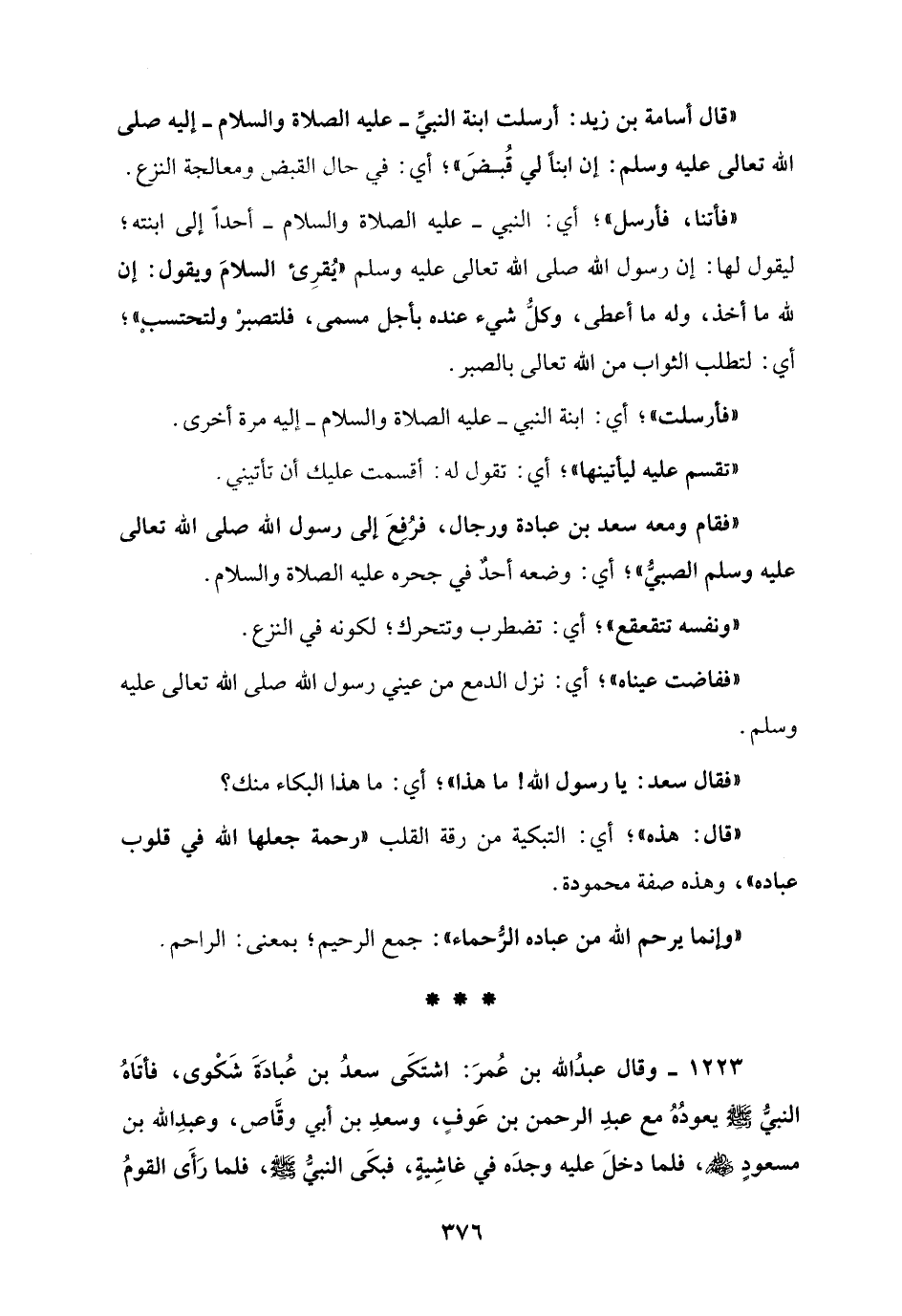 1223 - وقال عبدُ الله بن عُمرَ: اشتكَى سعدُ بن عُبادَةَ شَكْوى، فأتَاهُ النبي - صلى الله عليه وسلم - يعودُهُ مع عبدِ الرحمن بن عَوفٍ، وسعدِ بن أبي وقَّاص، وعبدِ الله بن مسعودٍ - رضي الله عنهم -، فلما دخلَ عليه وجدَه في غاشِيةٍ، فبكَى النبيُّ - صلى الله عليه وسلم -، فلما رَأَى القومُ