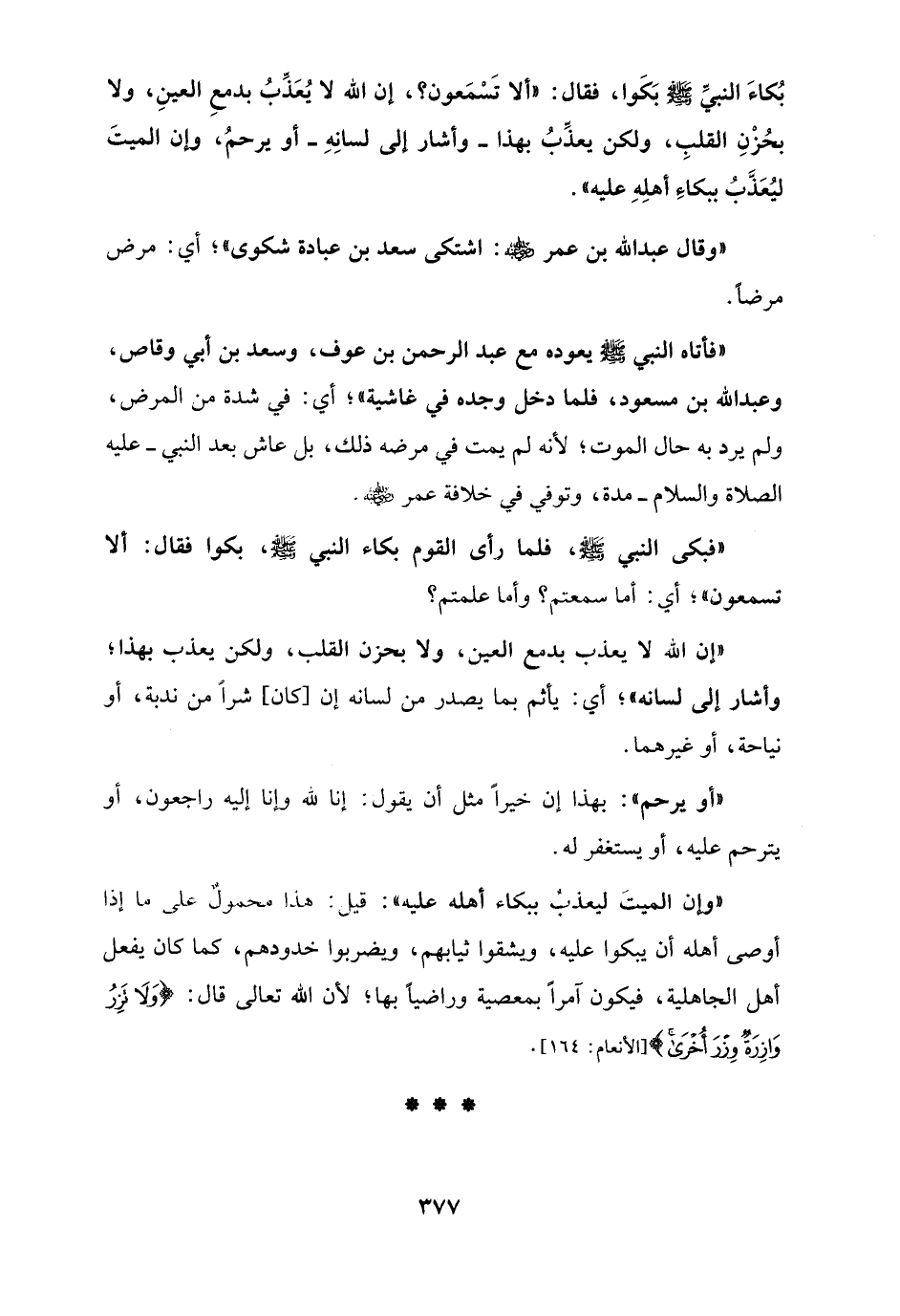 بُكاءَ النبيِّ - صلى الله عليه وسلم - بَكَوا، فقال: "ألا تَسْمَعون؟، إن الله لا يُعَذِّبُ بدمعِ العينِ، ولا بحُزْنِ القْلبِ، ولكن يعذبُ بهذا - وأشار إلى لسانِهِ - أو يرحمُ، وإن الميتَ ليُعَذَّبُ ببكاءِ أهلِهِ عليه".