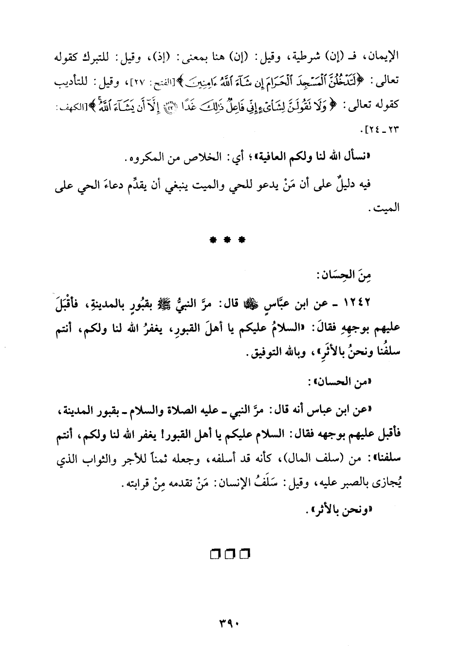 1242 - عن ابن عبَّاسٍ - رضي الله عنهما - قال: مرَّ النبي - صلى الله عليه وسلم - بقبُورٍ بالمدينةِ، فأقْبَلَ عليهم بوجهِهِ فقالَ: "السلامُ عليكم يا أهلَ القبورِ، يغفرُ الله لنا ولكم، أنتم سلفُنا ونحنُ بالأثَرِ" وبالله التوفيق.