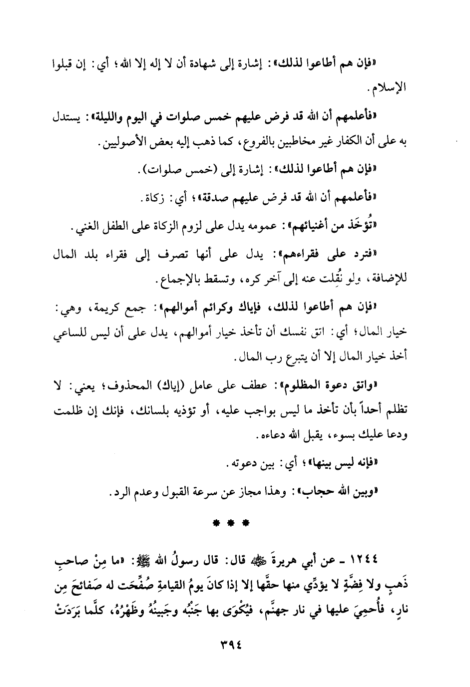 1244 - عن أبي هريرةَ - رضي الله عنه - قال: قال رسولُ الله - صلى الله عليه وسلم -: "ما مِنْ صاحبِ ذَهبٍ ولا فِضةٍ لا يؤدِّي منها حقَها إلا إذا كانَ يومُ القيامةِ صُفِّحَت له صَفائحَ مِن نارٍ، فأُحمِيَ عليها في نار جهنَّم، فيُكْوَى بها جَنْبُه وجَبينُهُ وظَهْرُهُ، كلَّما بَرَدَتْ
