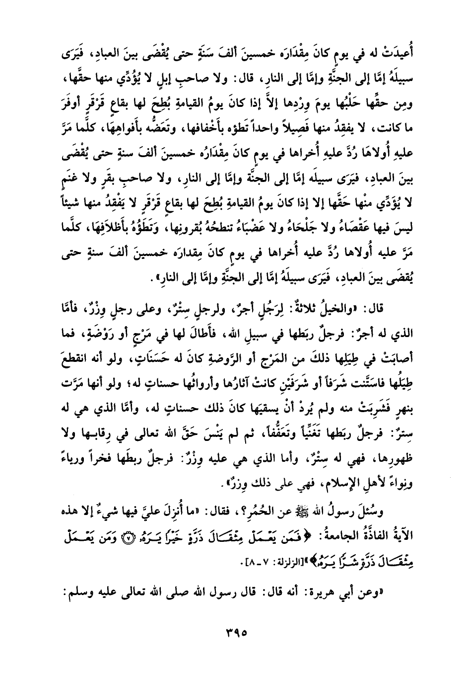 أُعيدَتْ له في يومٍ كانَ مِقدَارَه خمسينَ ألفَ سَنَةٍ حتى يُقْضَى بينَ العبادِ، فَيَرَى سبيلهُ إمَّا إلى الجنَّةِ وإمَّا إلى النارِ، قال: ولا صاحبِ إبلٍ لا يُؤُدِّي منها حقَّها، ومِن حقِّها حَلْبُها يومَ وِرْدِها إلَّا إذا كانَ يومُ القيامةِ بُطِح لها بقاعٍ قَرْقَرٍ أوفَرَ ما كانت، لا يفقِدُ منها فَصِيلاً واحداً تَطؤه بأَخْفافها، وتَعَضه بأَفواهِهَا، كلَّما مَرَّ عليهِ أُولاهَا رُدَّ عليهِ أُخراها في يومٍ كانَ مِقْدَارُه خمسينَ ألفَ سنةٍ حتى يُقْضى بينَ العبادِ، فيَرَى سبيله إمَّا إلى الجنَّة وإمَّا إلى النارِ، ولا صاحبِ بقَرٍ ولا غنَمٍ لا يُؤَدِّي منْها حَقَّها إلا إذا كانَ يومُ القيامةِ بُطِحَ لها بقاعٍ قَرْقَرٍ لا يَفْقِدُ منها شيئًا ليس فيها عَقْصَاءُ ولا جَلْحَاءُ ولا عَضْبَاءُ تنطحُهُ بُقرونها، وَتَطَؤُهُ بأَظلاَفِهَا، كلَّما مَرَّ عليه أُولاها رُدَّ عليه أُخراها في يومٍ كانَ مِقدارَه خمسينَ ألفَ سنةٍ حتى يُقضَى بينَ العبادِ، فَيَرَى سبيلهُ إمَّا إلى الجنَّةِ وإمَّا إلى النارِ".