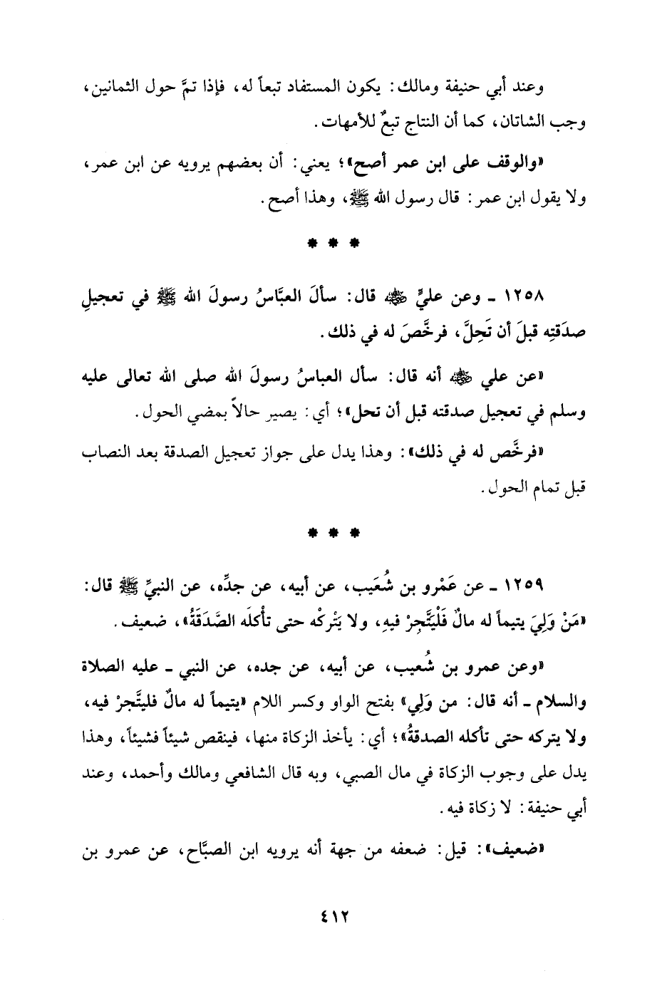 "وعن عمرو بن شُعيب، عن أبيه، عن جده، عن النبي - عليه الصلاة والسلام - أنه قال: من وَلِي" بفتح الواو وكسر اللام "يتيماً له مالٌ فليتَّجر فيه، ولا يتركه حتى تأكله الصدقةُ"؛ أي: يأخذ الزكاة منها، فينقص شيئاً فشيئاً، وهذا يدل عليه وجوب الزكاة في مال الصبي، وبه قال الشافعي ومالك وأحمد، وعند أبي حنيفة: لا زكاة فيه.