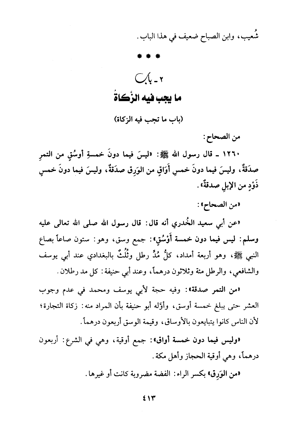 1260 - قال رسول الله - صلى الله عليه وسلم -: "ليسَ فيما دونَ خمسةِ أوسُقٍ من التمرِ صدَقة، وليسَ فيما دونَ خمسِ أَوَاقٍ من الوَرِق صدَقة، وليسَ فيما دونَ خمسٍ ذَوْدٍ من الإبلِ صدقةٌ".