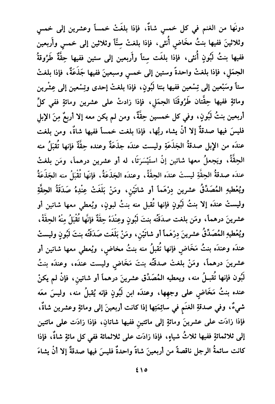 دونَها من الغنم في كل خمسٍ شاة، فإذا بلغَتْ خمساً وعشرين إلى خمسٍ وثلاثينَ ففيها بنتُ مخَاضٍ أُنثى، فإذا بلغتْ سِتًّا وثلاثين إلى خمسٍ وأَربعين ففيها بنتُ لبونٍ أُنثى، فإذا بلغَت سِتاً وأَربعين إلى ستين ففيها حِقَّة طَرُوقةُ الجمَلِ، فإذا بلغتْ واحدة وستين إلى خمسٍ وسبعينَ ففيها جَذَعَة، فإذا بلغتْ ستاً وسبْعين إلى تِسْعين ففيها بنتا لبونٍ، فإذا بلغتْ إحدى وتسعين إلى عِشْرين ومائةٍ ففيها حِقَّتان طَرُوقتا الجمَلِ، فإذا زادتْ على عشرين ومائةٍ ففي كلِّ أربعين بنتُ لَبُونٍ، وفي كل خمسين حِقَّة، ومن لم يكن معه إلا أربعٌ مِنَ الإبلِ فليسَ فيها صدقة إلا أنْ يشاء ربِّها، فإذا بلغت خمساً ففيها شاةٌ، ومن بلغت عندَه من الإبل صدقةُ الجَذَعَةِ وليست عندَه جذَعَةٌ وعنده حِقَّة فإنها تُقبَلُ منه الحِقَّةُ، ويَجعلُ معها شاتين إنْ استَيْسَرَتَا، له أو عشرين درهماً، ومَن بلغتْ عندَه صدقةُ الحِقَّةِ ليست عندَه الحِقَّة، وعندَه الجَذَعَهُ، فإنها تُقبَل منه الجَذَعَةُ ويُعطيهِ المُصَدِّقُ عشرين دِرهماً أو شاتَيْنِ، ومَنْ بَلَغَتْ عِنْدِهُ صَدَقَةُ الحِقَّةِ وليستْ عندَه إلا بنت لَبُونٍ فإنها تُقبل منه بنتُ لبونٍ، ويُعطي معها شاتين أو عشرينَ درهماً، ومَن بلغت صدَقته بنتَ لَبُون وعِندَهُ حِقَّةً فإنَّها تقْبَلُ مِنهُ الحقَّة، ويُعْطيهِ المُصَدِّقُ عشرينَ درهما أو شاتَيْنِ، ومَنْ بَلَغَت صَدَقته بنتَ لَبُون وليستْ عندَه وعندَه بنتُ مَخَاضٍ فإنها تُقبلُ منه بنت مخاضٍ، ويُعطي معها شاتين أو عشرينَ درهماً، ومَنْ بلغت صدقته بنتَ مَخَاضٍ وليست عندَه، وعندَه بنتُ لَبُون فإنها تُقبلُ منه، ويعطيه المُصَدِّق عشرينَ درهماً أو شاتينِ، فإنْ لم يكنْ عنده بنتُ مَخَاضٍ على وجهِها، وعندَه ابن لبون فإنه يُقبلُ منه، وليسَ معَه شيء، وفي صدقةِ الغنَم في سائِمَتِها إذا كانت أربعينَ إلى ومائةٍ وعشرين شاةٌ، فإذا زادَت على عشرينَ ومائةٍ إلى مائتينِ ففيها شاتانِ، فإذا زادَت على مائتين إلى ثلاثمائةٍ ففيها ثلاثُ شياهٍ، فإذا زادَت على ثلاثمائة ففي كل مائةٍ شاةٌ، فإذا كانت سائمةُ الرجل ناقصةً من أربعينَ شاةً واحدةٌ فليسَ فيها صدقةٌ إلا أنْ يشاءَ