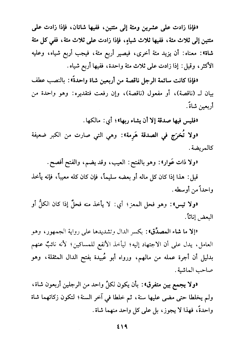 "فإذا زادت على عشرين ومئة إلى مئتين، ففيها شاتان، فإذا زادت على مئتين إلى ثلاث مئة، ففيها ثلاث شياهٍ، فإذا زادت على ثلاث مئة، ففي كل مئة شاة": معناه: أن يزيد مئة أخرى، فيصير أربع مئة، فيجب أربع شياه، وعليه الأكثر، وقيل: إذا زادت على ثلاث مئة واحدة، ففيها أربع شياه.