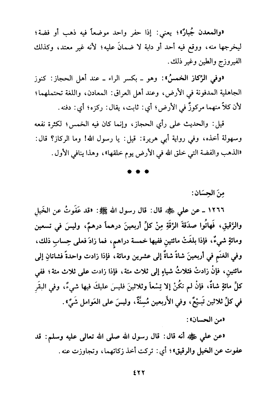 1266 - عن علي - رضي الله عنه - قال: قال رسول الله - صلى الله عليه وسلم -: "قد عَفَوتُ عن الخَيلِ والرَّقيقِ، فَهاتُوا صدَقةَ الرِّقَةِ مِنْ كلِّ أربعينَ درهماً درهم، وليسَ في تسعين ومائةٍ شيءٌ، فإذا بلغَتْ مائتينِ ففيها خمسة دراهم، فما زادَ فعلى حِسابِ ذلك، وفي الغنَم في أربعينَ شاةً شاةٌ إلى عشرين ومائة، فإذا زادت واحدةً فشاتانِ إلى مائتينِ، فإنْ زادتْ فثلاثُ شياهٍ إلى ثلاث مئة، فإذا زادت على ثلاث مئة؛ ففي كلِّ مائةٍ شاةٌ، فإنْ لم تكُنْ إلا تِسْعاً وثلاثينَ فليسَ عليكَ فيها شيء، وفي البقَرِ في كلِّ ثلاثين تَبيعْ، وفي الأَربعين مُسِنَّة، وليسَ على العَوامل شَيٌ".