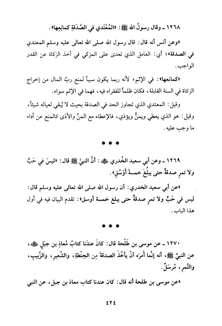 1270 - عن موسى بن طَلْحة قال: كانَ عندَنا كتابُ مُعاذِ بن جبَلٍ - رضي الله عنه -، عن النبيِّ - صلى الله عليه وسلم -، أنه إنَّما أَمرَه أنْ يأخُذَ الصدقةَ مِن الحِنْطةِ، والشَّعيرِ، والزَّبيبِ، والتَّمرِ، مُرسَل.