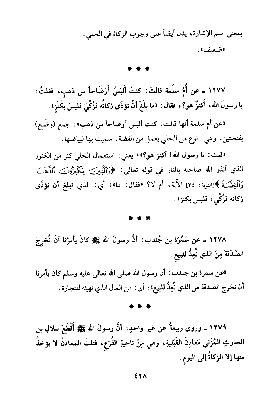 1277 - عن أُمِّ سلَمة قالتْ: كنتُ أَلبَسُ أَوْضَاحاً من ذهبٍ، فقلتُ: يا رسولَ الله، أكَنزٌ هو؟، فقال: "ما بلَغَ أنْ تؤدَّى زكاتُه فزكِّيَ فليسَ بكَنْزٍ".