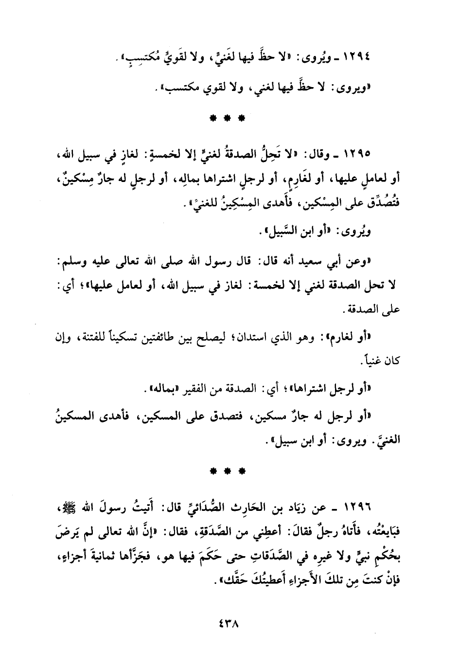 1295 - وقال: "لا تَحِلُّ الصدقةُ لغنيٍّ إلا لخمسةٍ: لغازٍ في سبيل الله، أو لعاملٍ عليها، أو لغَارِمٍ، أو لرجل اشتراها بمالِه، أو لرجلٍ له جارٌ مِسْكين، فتُصُدِّق على المِسْكين، فأَهدى المِسكِين للغنيِّ".