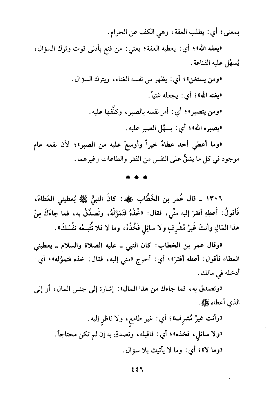 1306 - قال عُمر بن الخَطَّاب - رضي الله عنه -؛ كانَ النبي - صلى الله عليه وسلم - يُعطيني العَطاءَ، فَأقولُ: أَعطِهِ أفقرَ إليه منِّي، فقال: "خُذْهُ فتَمَوَّلْهُ، وتَصدَّقْ به، فما جاءَكَ مِنْ هذا المَالِ وأنتَ غَير مُشرِفٍ ولا سائِلٍ فَخُذْهُ، وما لا فلا تتبعه نفْسَكَ".