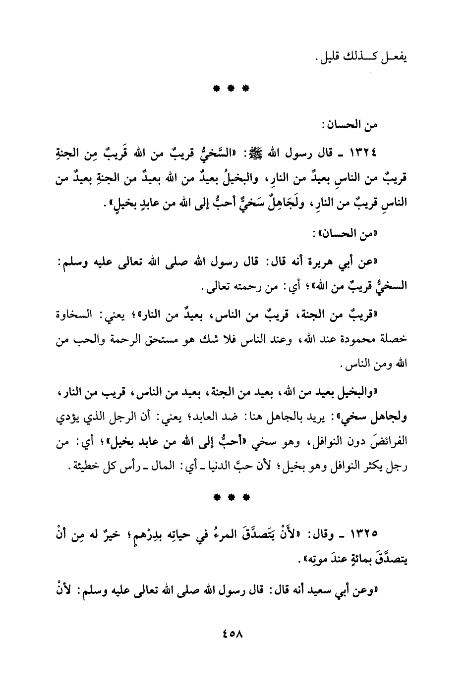 1324 - قال رسول الله - صلى الله عليه وسلم -: "السَّخيُّ قريبٌ من الله قَريبٌ مِن الجنةِ قريبٌ من الناسِ بعيدٌ من النارِ، والبخيلُ بعيدٌ من الله بعيدٌ من الجنةِ بعيدٌ من الناسِ قريبٌ من النارِ، ولَجَاهِلٌ سَخيٌّ أحبُّ إلى الله من عابدٍ بخيلٍ".