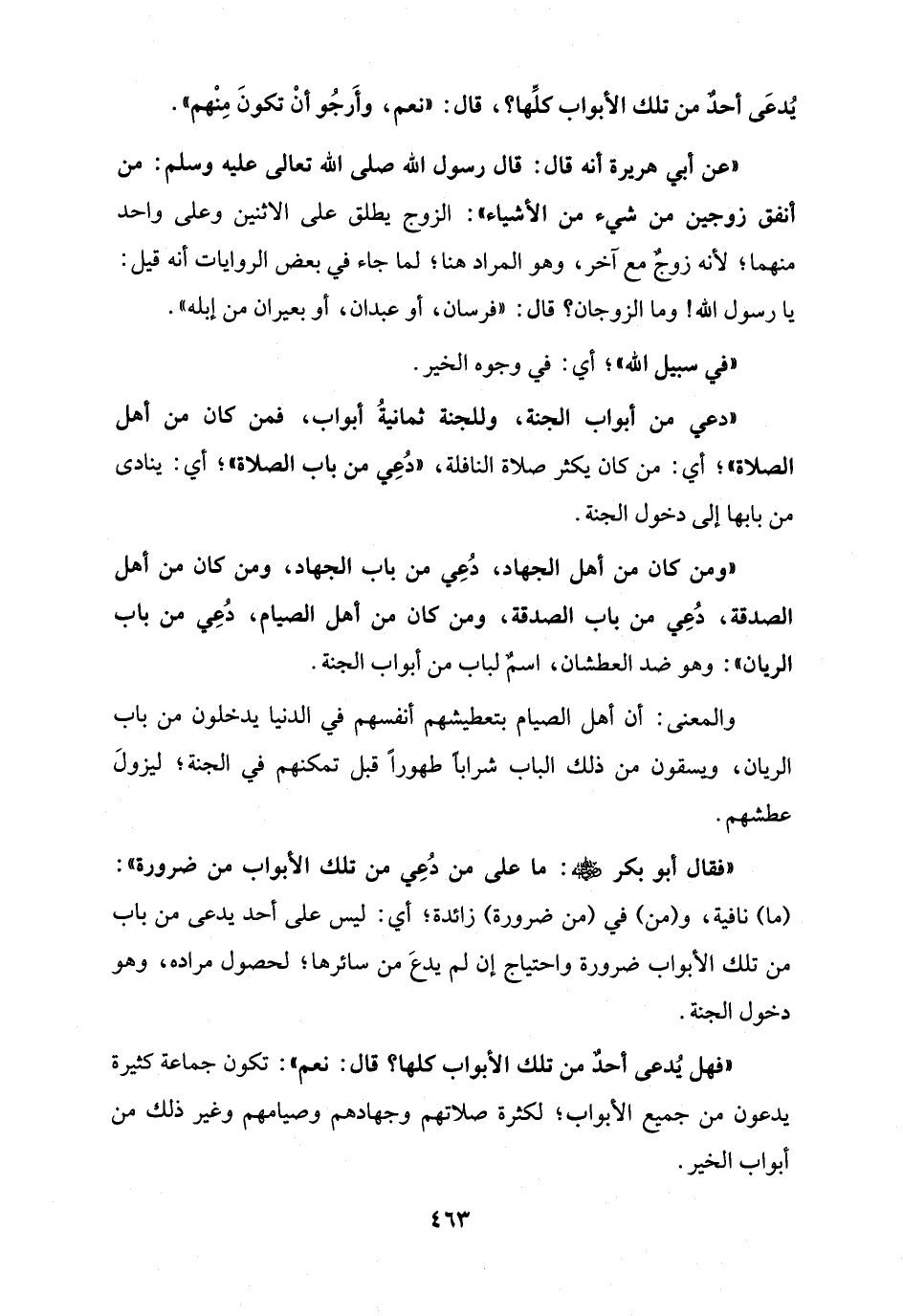 "ومن كان من أهل الجهاد، دُعِي من باب الجهاد، ومن كان من أهل الصدقة، دُعِي من باب الصدقة، ومن كان من أهل الصيام، دُعِي من باب الريان": وهو ضد العطشان، اسمٌ لباب من أبواب الجنة.