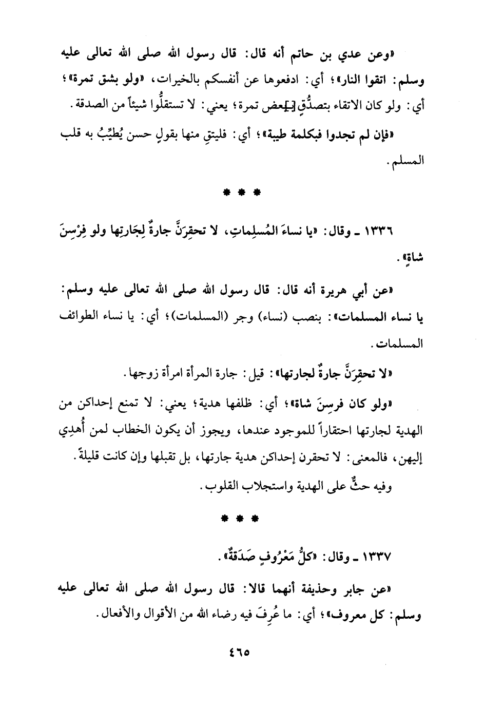 1336 - وقال: "يا نساءَ المُسلِماتِ، لا تحقِرَنَّ جارةٌ لِجَارتها ولو فِرْسِنَ شاةٍ".