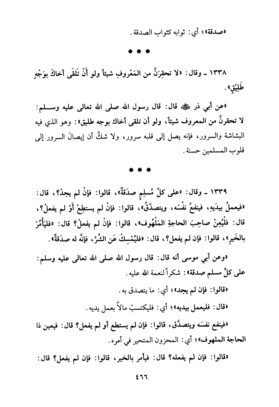 1339 - وقال: "على كلِّ مُسلِمٍ صدَقةٌ"، قالوا: فإن لم يجدْ؟، قال: "فيعملُ بيدَيهِ، فينفعُ نفسَه، ويتصدَّقُ"، قالوا: فإنْ لم يستطِعْ أَوْ لم يفعلْ؟، قال: فلْيُعِنْ صاحِبَ الحاجةِ المَلْهُوف"، قالوا: فإنْ لم يفعلْ؟ قال: "فليَأمُرْ بالخَيرِ"، قالوا: فإن لم يفعل؟، قال: "فليُمْسِكْ عَن الشَّرِّ، فإنَّه له صدَقةٌ".