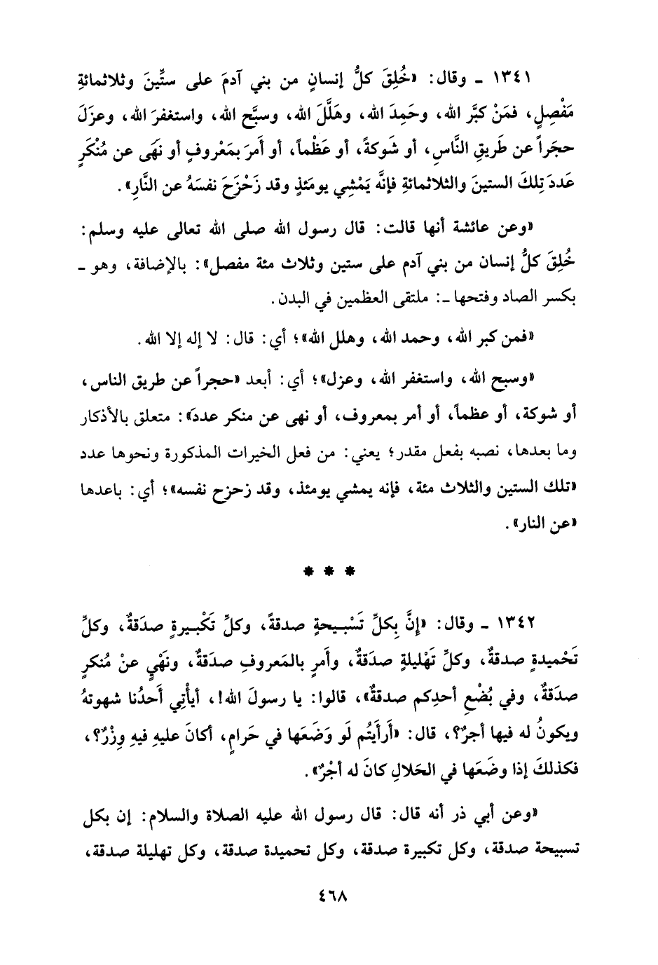 1341 - وقال: "خُلِقَ كلُّ إنسانٍ من بني آدمَ على ستِّينَ وثلاثمائةِ مَفْصِلٍ، فمَنْ كبَّر الله، وحَمِدَ الله، وهَلَّلَ الله، وسبَّح الله، واستغفرَ الله، وعزَلَ حجَرًا عن طَريقِ النَّاسِ، أو شَوكةً، أو عَظْمًا، أو أَمرَ بمَعْروفٍ أو نهَى عن مُنْكَرٍ عَددَ تِلكَ الستينَ والثلاثمائةِ فإنَّه يَمْشِي يومَئذٍ وقد زَحْزَحَ نفسَهُ عن النَّارِ".