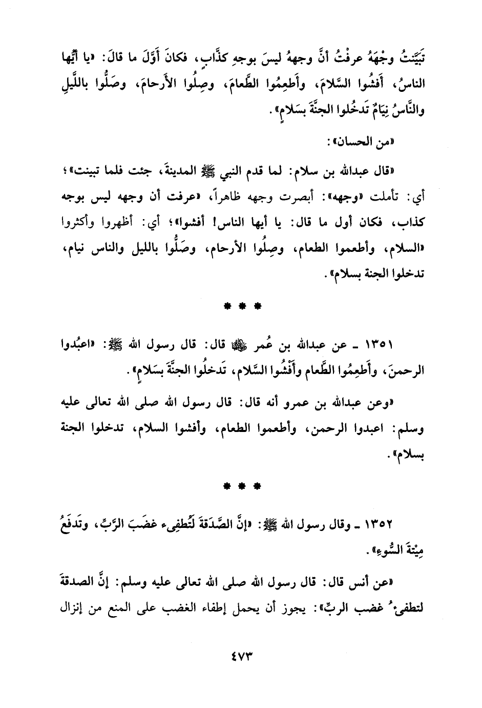 1351 - عن عبد الله بن عُمر - رضي الله عنهما - قال: قال رسول الله - صلى الله عليه وسلم -: " اعبُدوا الرحمنَ، وأَطعِمُوا الطَّعام وأَفْشُوا السَّلام، تَدخلُوا الجنَّةَ بسَلامٍ".