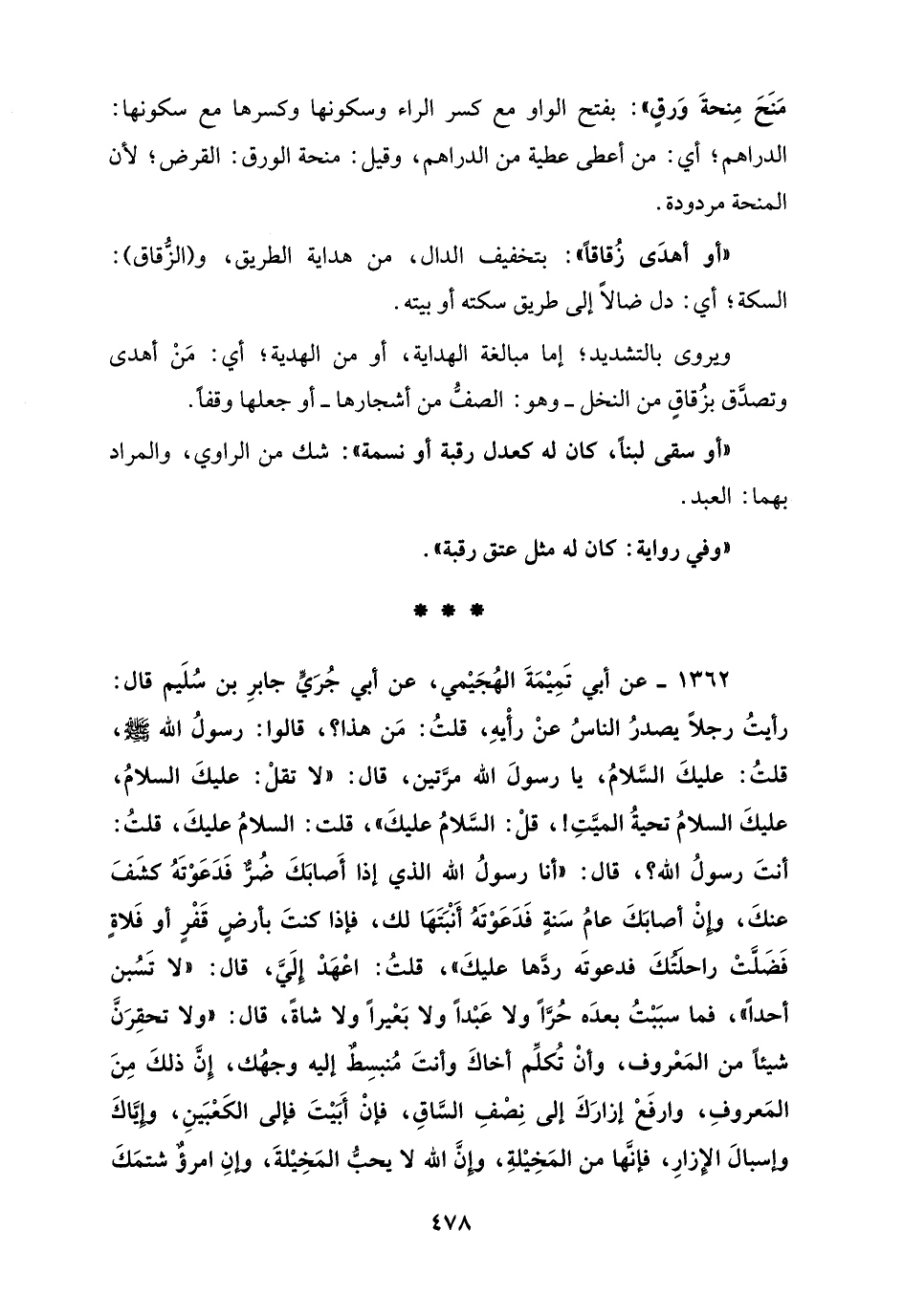 1362 - عن أبي تَمِيْمَةَ الهُجَيْمي، عن أبي جُرَيٍّ جابرِ بن سُلَيم قال: رأيتُ رجلًا يصدرُ الناسُ عنْ رأْيهِ، قلتُ: مَن هذا؟، قالوا: رسولُ الله - صلى الله تعالى عليه وسلم -، قلتُ: عليكَ السَّلامُ، يا رسولَ الله مرَّتين، قال: "لا تقلْ: عليكَ السلامُ، عليكَ السلامُ تحيةُ الميَّتِ!، قلْ: السَّلامُ عليكَ"، قلت: السلامُ عليكَ، قلتُ: أنتَ رسولُ الله؟، قال: "أنا رسولُ الله الذي إذا أَصابَكَ ضُرٌّ فَدَعَوْتَهُ كشَفَ عنكَ، وإنْ أصابَكَ عامُ سَنةٍ فَدَعَوْتَهُ أَنْبَتَهَا لك، فإذا كنتَ بأرضٍ قَفْرٍ أو فَلاةٍ فَضَلَّتْ راحلَتُكَ فدعوتَه ردَّها عليكَ"، قلتُ: اعْهَدْ إلَيَّ، قال: "لا تَسُبن أحدًا"، فما سبَبْتُ بعدَه حُرًّا ولا عَبْدًا ولا بَعْيرًا ولا شاةً، قال: "ولا تحقِرَنَّ شيئًا من المَعْروف، وأن تُكلِّم أخاكَ وأنتَ مُنبسِطٌ إليه وجهُك، إِنَّ ذلكَ مِنَ المَعروف، وارفَعْ إزارَكَ إلى نِصْفِ السَّاقِ، فإن أَبَيْتَ فإلى الكَعْبَينِ، وإِيَّاكَ وإسبالَ الإزارِ، فإنَّها من المَخِيْلةِ، وإنَّ الله لا يحبُّ المَخِيْلةَ، وإنِ امرؤٌ شتمَكَ