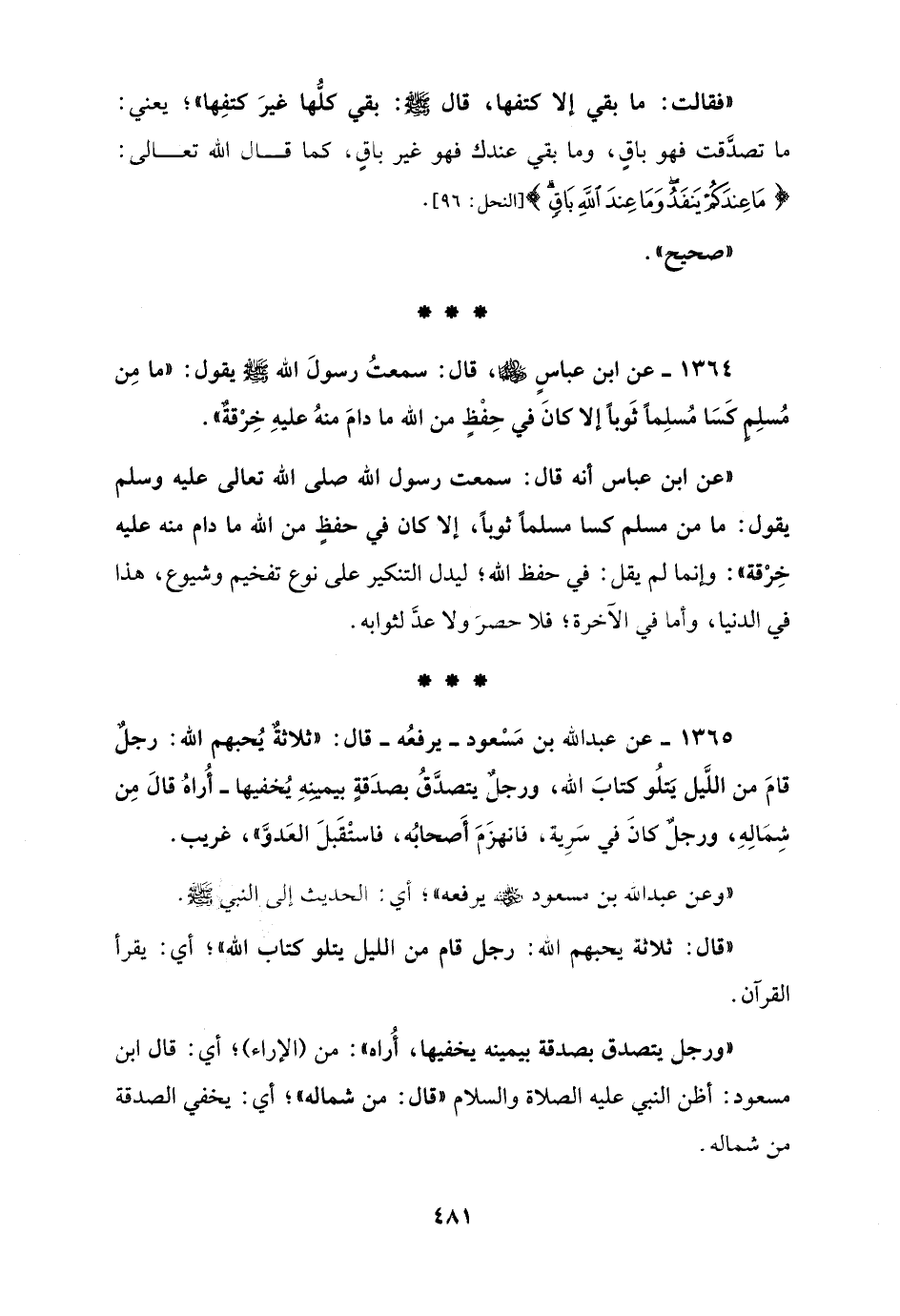 1365 - عن عبد الله بن مَسْعود - يرفعُه - قال: "ثلاثةٌ يُحبهم الله: رجلٌ قامَ من اللَّيل يتلُو كتابَ الله، ورجلٌ يتصدَّقُ بصدَقةٍ بيمينِهِ يُخفيها - أُراهُ قالَ مِن شِمَالِهِ، ورجلٌ كانَ في سَرِية، فانهزَمَ أَصحابُه، فاستْقَبلَ العَدوَّ"، غريب.