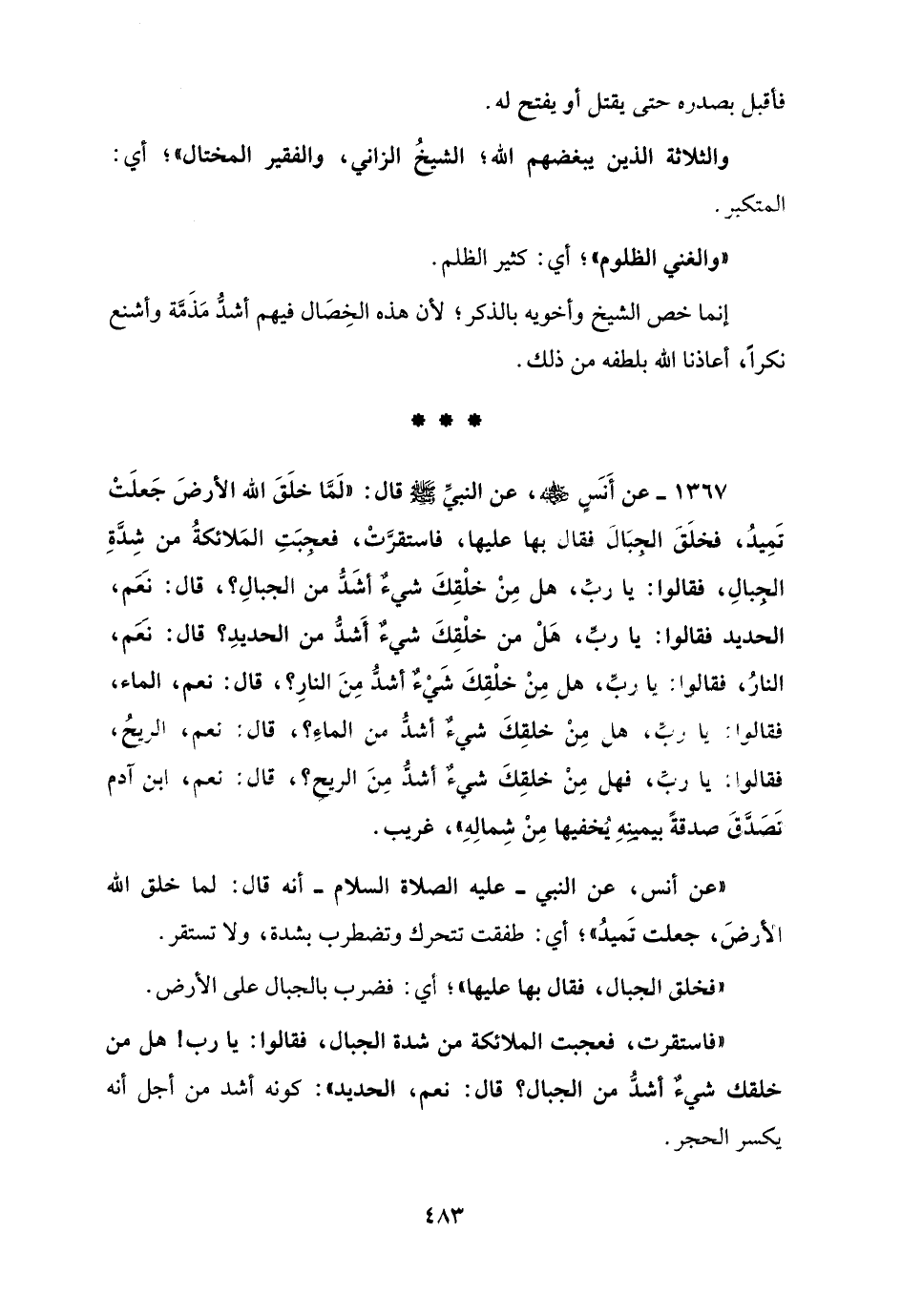 1367 - عن أَنس - رضي الله عنه -، عن النبيِّ - صلى الله عليه وسلم - قال: "لَمَّا خلَقَ الله الأرضَ جَعلَتْ تَمِيدُ، فخلَقَ الجبَالَ فقال بها عليها، فاستقرَّتْ، فعجبَتِ المَلائكةُ من شِدَّةِ الجبالِ، فقالوا: يا ربِّ، هل مِنْ خلْقِكَ شيءٌ أشَدُّ من الجبالِ؟، قال: نَعَم، الحديد فقالوا: يا ربِّ، هَلْ من خلْقِكَ شيءٌ أَشدُّ من الحديدِ؟ قال: نَعَم، النارُ، فقالوا: ياربِّ، هل مِنْ خلْقِكَ شَيْءٌ أشدُّ مِنَ النارِ؟، قال: نعم، الماء، فقالوا: يا ربِّ، هل مِنْ خلقِكَ شيءٌ أشدُّ من الماءِ؟، قال: نعم، الريحُ، فقالوا: يا ربِّ، فهل مِنْ خلقِكَ شيءٌ أشدُّ مِنَ الريح؟، قال: نعم، ابن آدم تَصَدَّقَ صدقةً بيمينِهِ يُخفيها مِنْ شِمالِهِ"، غريب.