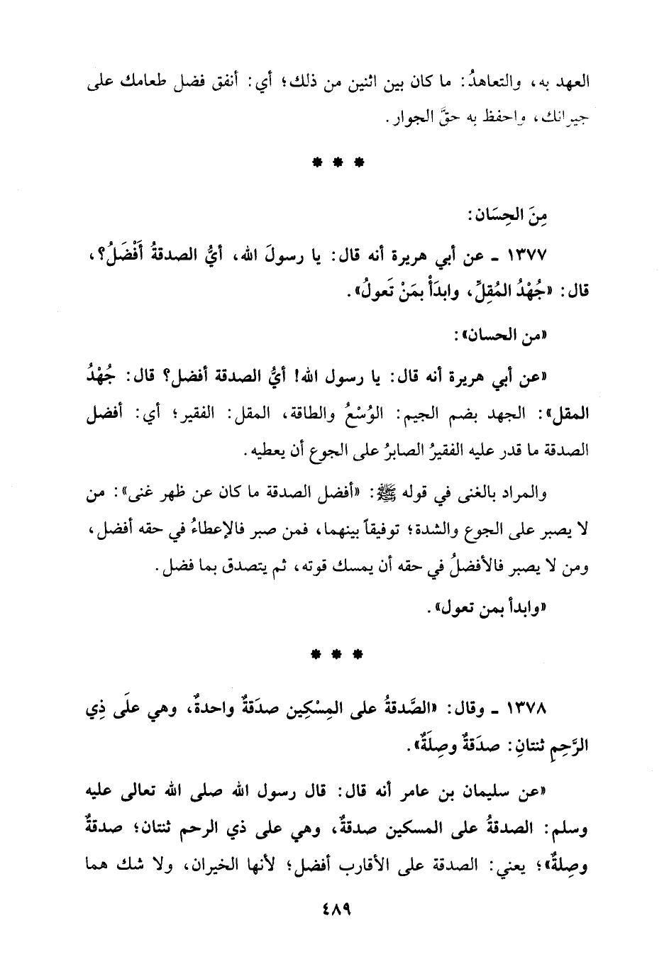 1377 - عن أبي هريرة أنه قال: يا رسولَ الله، أيُّ الصدقةُ أَفْضَلُ؟، قال: "جُهْدُ المُقِلِّ، وابدَأْ بمَنْ تَعولُ".