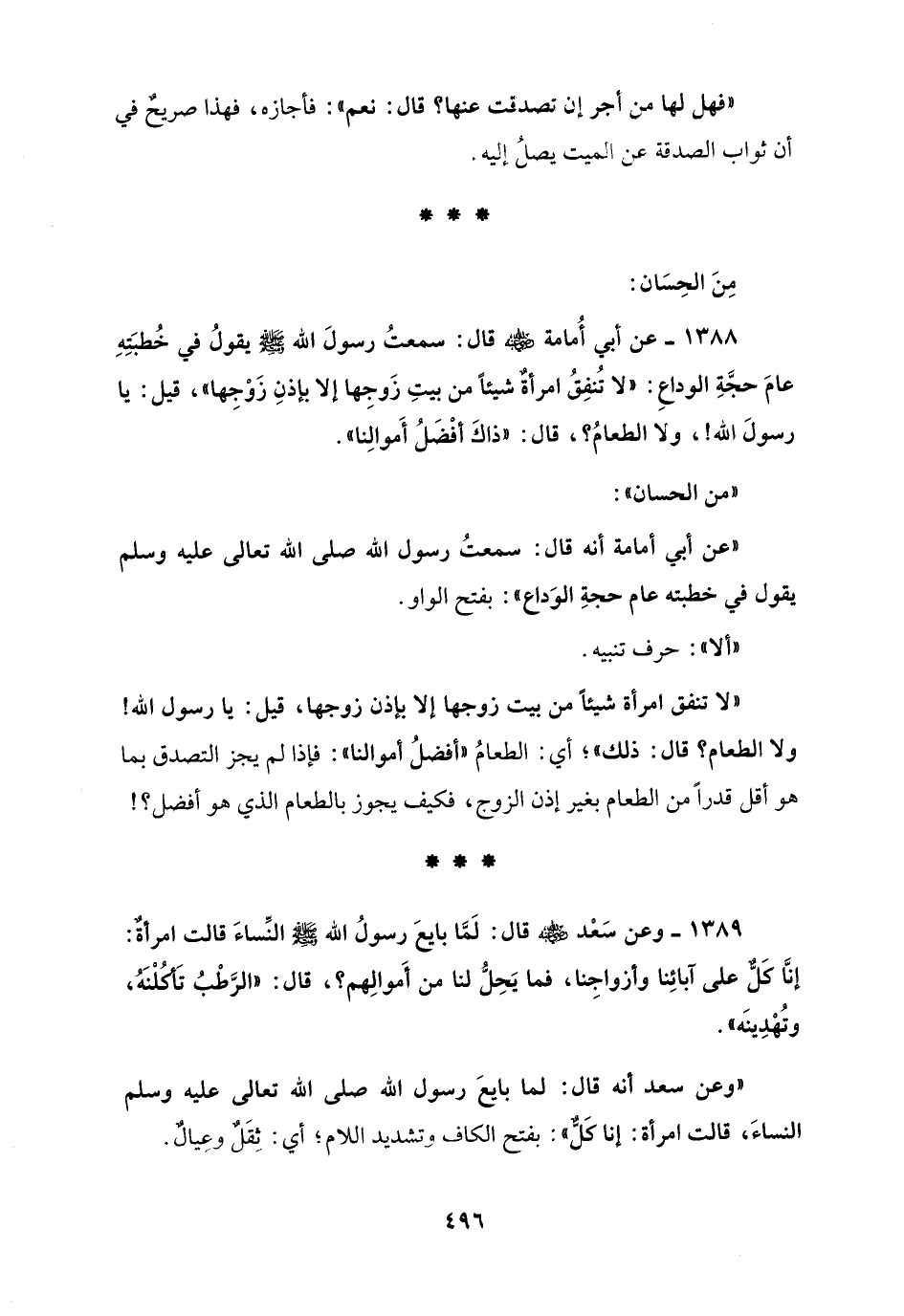 1388 - عن أبي أُمامة - رضي الله عنه - قال: سمعتُ رسولَ الله - صلى الله عليه وسلم - يقولُ في خُطبَتِهِ عامَ حجَّةِ الوداعِ: "لا تُنفِقُ امرأةٌ شيئًا من بيتِ زَوجِها إلا بإذنِ زَوْجِها"، قيل: يا رسولَ الله!، ولا الطعامُ؟، قال: "ذاكَ أفْضَلُ أَموالِنا".