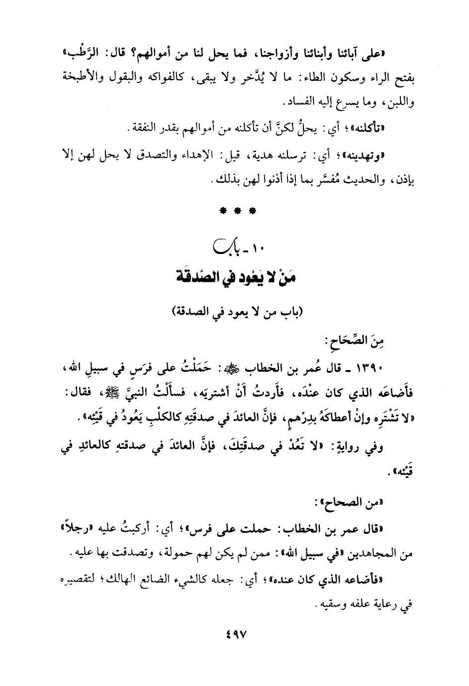 1390 - قال عُمر بن الخطاب - رضي الله عنه -: حَمَلْتُ على فرَسٍ في سبيلِ الله، فأضاعَه الذي كان عنْدَه، فأردتُ أَنْ أشتريَه، فسألْتُ النبيَّ - صلى الله عليه وسلم -، فقال: "لا تَشْتَرِه وإنْ أعطاكَهُ بدِرْهم، فإنَّ العائدَ في صدقَتِهِ كالكلْبِ يَعُودُ في قَيْئه ".