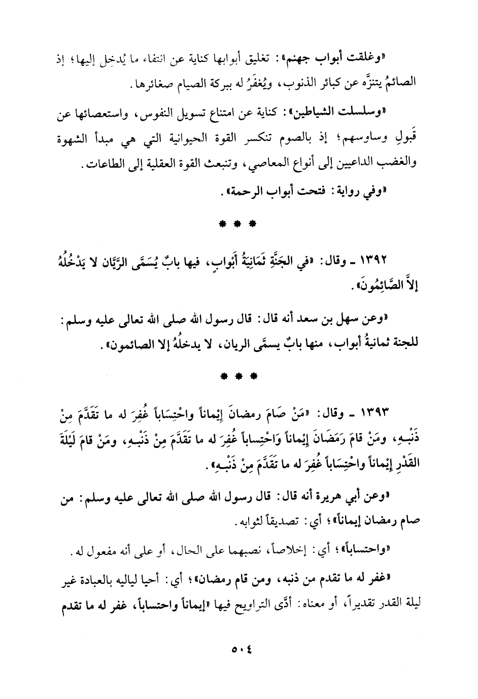 1393 - وقال: "مَنْ صَامَ رمضانَ إِيْماناً واحْتِسَاباً غُفِرَ له ما تَقَدَّمَ مِنْ ذَنْبهِ، ومَنْ قامَ رَمَضَانَ إِيْماناً وَاحْتِساباً غُفِرَ له ما تَقَدَّمَ مِنْ ذَنْبهِ، ومَنْ قامَ لَيْلَةَ القَدْرِ إِيْماناً واحْتِسَاباً غُفِرَ له ما تَقَدَّمَ مِنْ ذَنْبهِ".