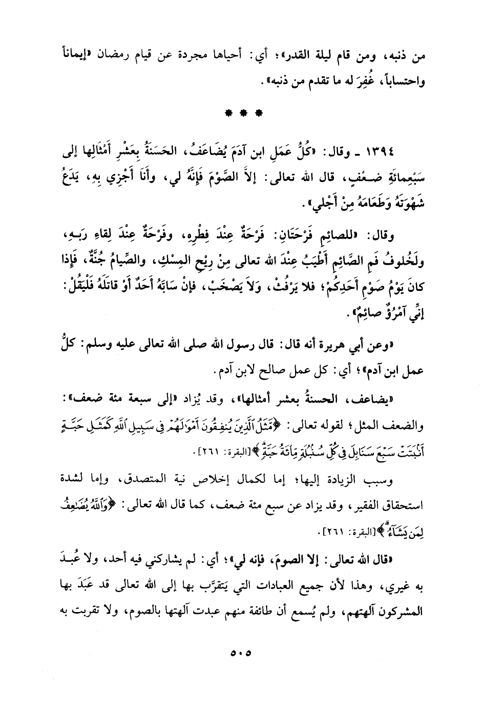 1394 - وقال: "كُلُّ عَمَلِ ابن آدَمَ يُضَاعَفُ، الحَسَنَةُ بِعَشْرِ أَمْثَالِها إلى سَبْعِمائَةِ ضعْفٍ، قال الله تعالى: إلَّا الصَّوْمَ فَإِنَّهُ لي، وأَنَا أَجْزِي بِهِ، يَدَعُ شَهْوَتَهُ وَطَعَامَهُ مِنْ أَجْلي".