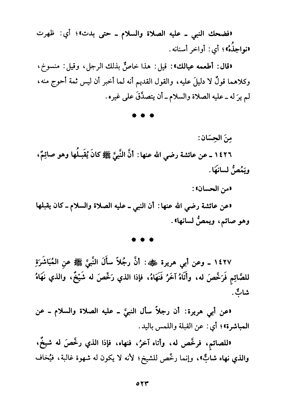 1427 - وعن أبي هريرة - رضي الله عنه -: أنَّ رجُلاً سأَلَ النَّبيَّ - صلى الله عليه وسلم - عنِ المُبَاشَرَةِ للصَّائِمِ فَرَخَّصَ له، وأَتَاهُ آخَرُ فَنَهَاهُ، فإذا الذي رَخَّصَ له شَيْخٌ، والذي نَهَاهُ شابٌّ.