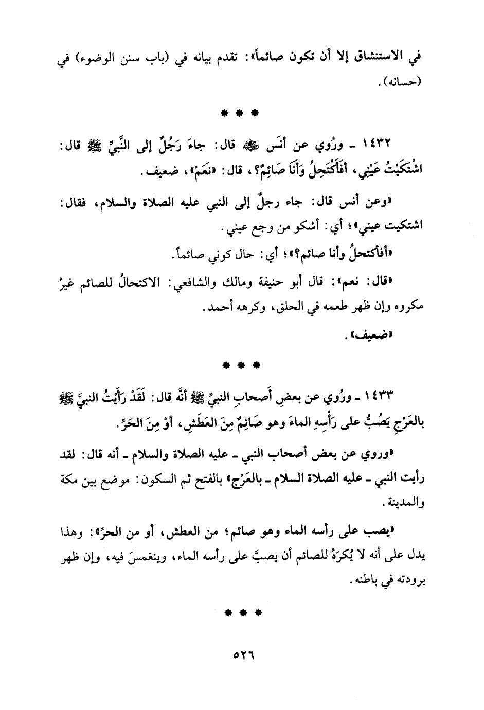 1433 - ورُوي عن بعضِ أَصحابِ النبيِّ - صلى الله عليه وسلم - أنَّه قال: لَقَدْ رَأَيْتُ النبيَّ - صلى الله عليه وسلم - بالعَرْجِ يَصُبُّ على رَأْسِهِ الماءَ وهو صَائِمٌ مِنَ العَطَشِ، أوْ مِنَ الحَرِّ.