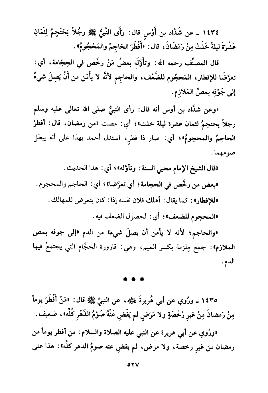 1434 - عن شَدَّاد بن أَوْسٍ قال: رَأَى النَّبيُّ - صلى الله عليه وسلم - رجُلاً يَحْتَجِمُ لِثَمَانِ عَشْرَةَ ليلةً خَلَتْ مِنْ رَمَضَانَ، قال: "أَفْطَرَ الحَاجِمُ والمَحْجُومُ".