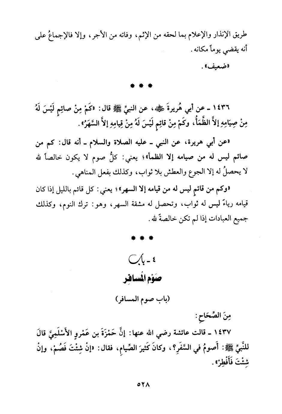 1436 - عن أبي هُريرةَ - رضي الله عنه -، عن النبيِّ - صلى الله عليه وسلم - قال: "كَمْ مِنْ صائِمٍ لَيْسَ لَهُ مِنْ صِيَامِهِ إلَّا الظَّمَأُ، وكَمْ مِنْ قائِمٍ لَيْسَ لَهُ مِنْ قِيامِهِ إلَّا السَّهَرُ".