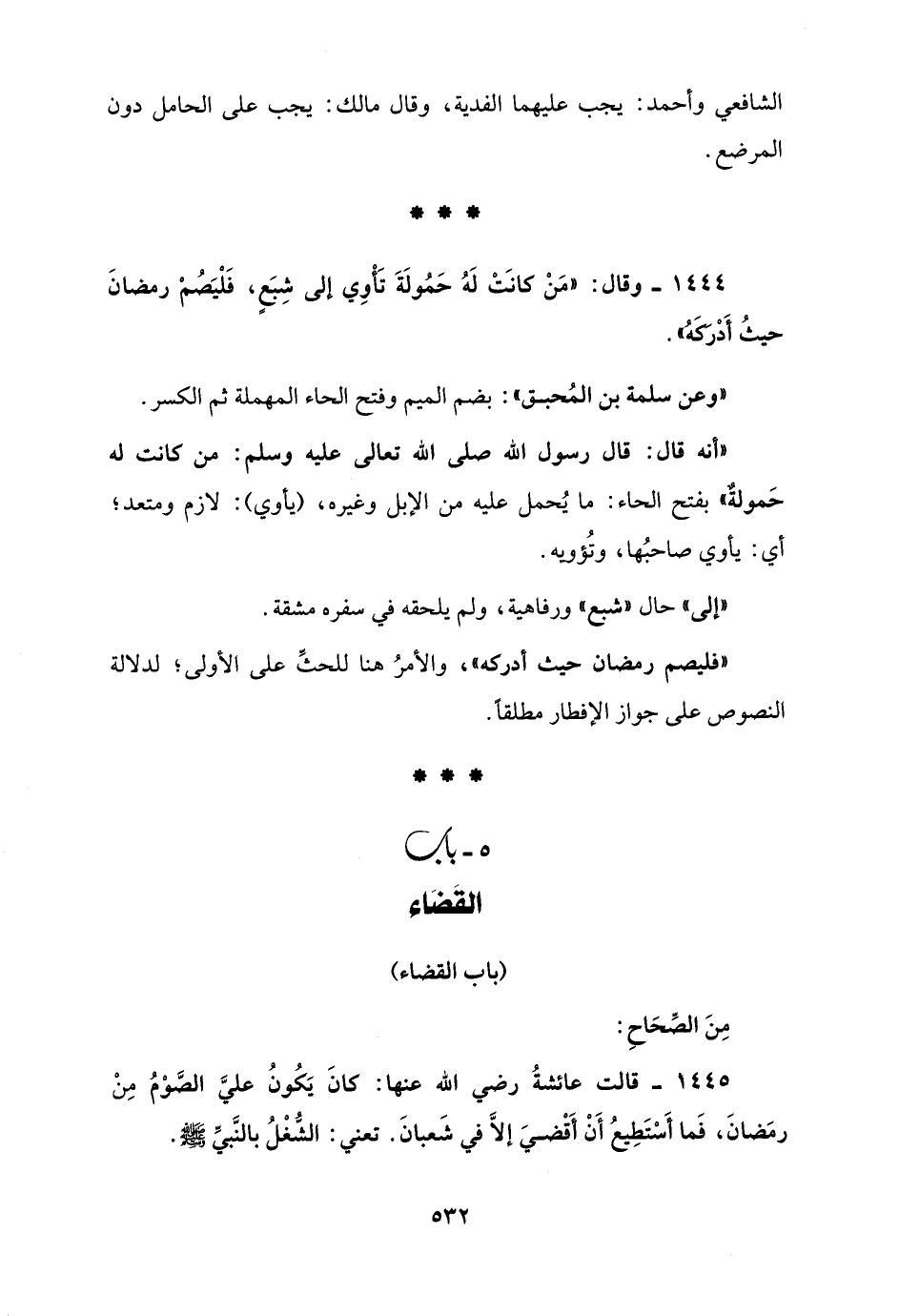 1444 - وقال: "مَنْ كانَتْ لَهُ حَمُولَةَ تَأْوِي إلى شِبَعٍ، فَلْيَصُمْ رمضانَ حيثُ أَدْرَكَهُ".