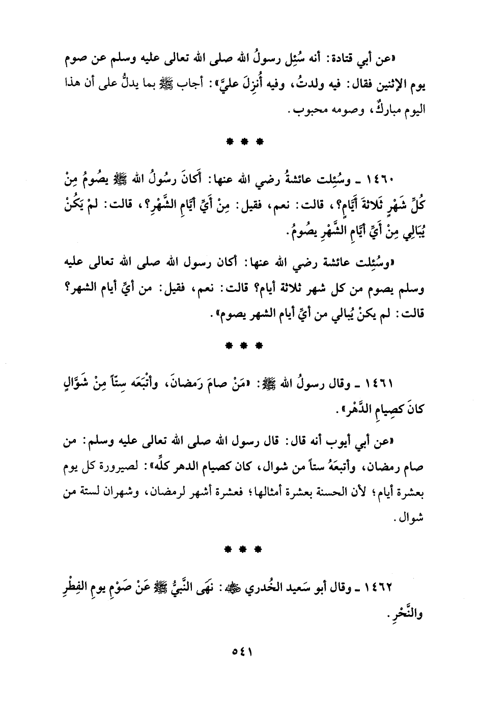 1461 - وقال رسولُ الله - صلى الله عليه وسلم -: "مَنْ صامَ رَمضانَ، وأتْبَعَه سِتًّا مِنْ شَوَّالٍ كانَ كصِيامِ الدَّهْر".