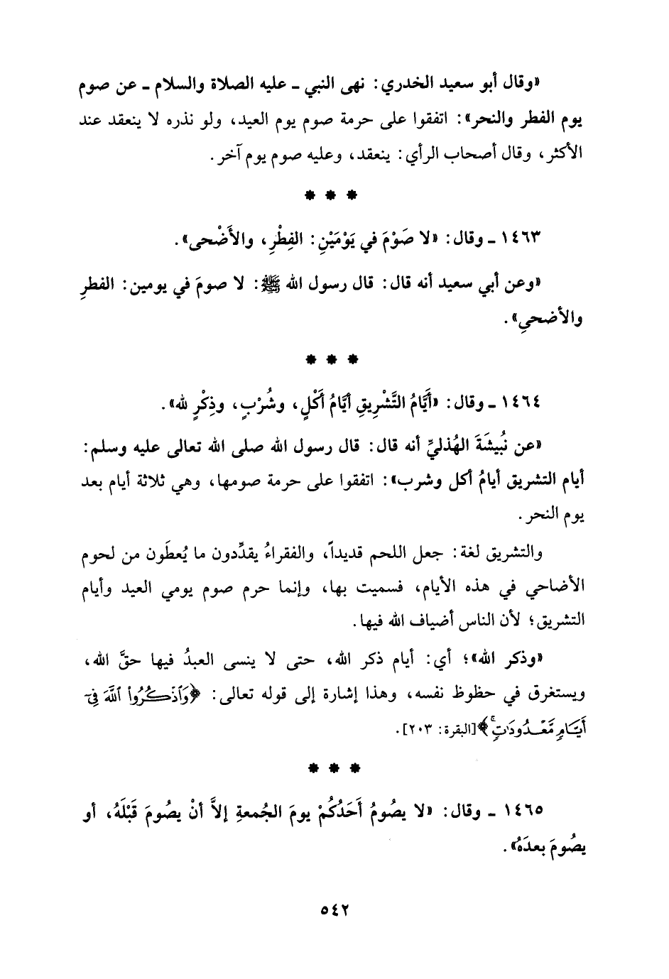 "عن نُبيشَةَ الهُذليِّ أنه قال: قال رسول الله صلى الله تعالى عليه وسلم: أيام التشريق أيامُ أكل وشرب": اتفقوا على حرمة صومها، وهي ثلاثة أيام بعد يوم النحر.