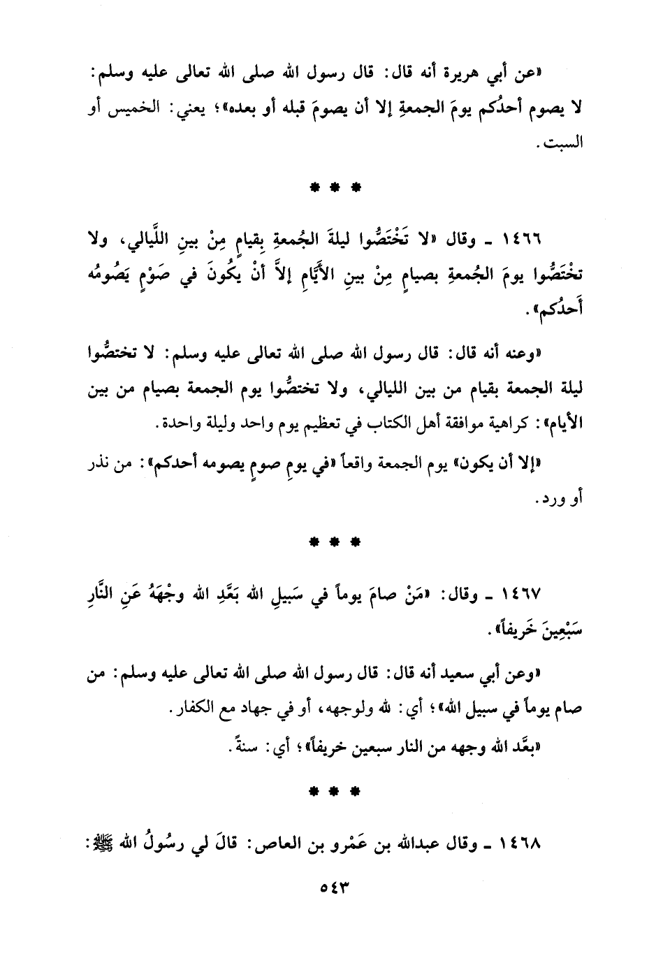 1466 - وقال "لا تَخْتَصُّوا ليلةَ الجُمعةِ بِقيامٍ مِنْ بينِ اللَّيالي، ولا تخْتَصُّوا يومَ الجُمعةِ بصيامٍ مِنْ بينِ الأَيَّامِ إلَّا أنْ يكُونَ في صَوْمٍ يَصُومُه أَحدُكم".
