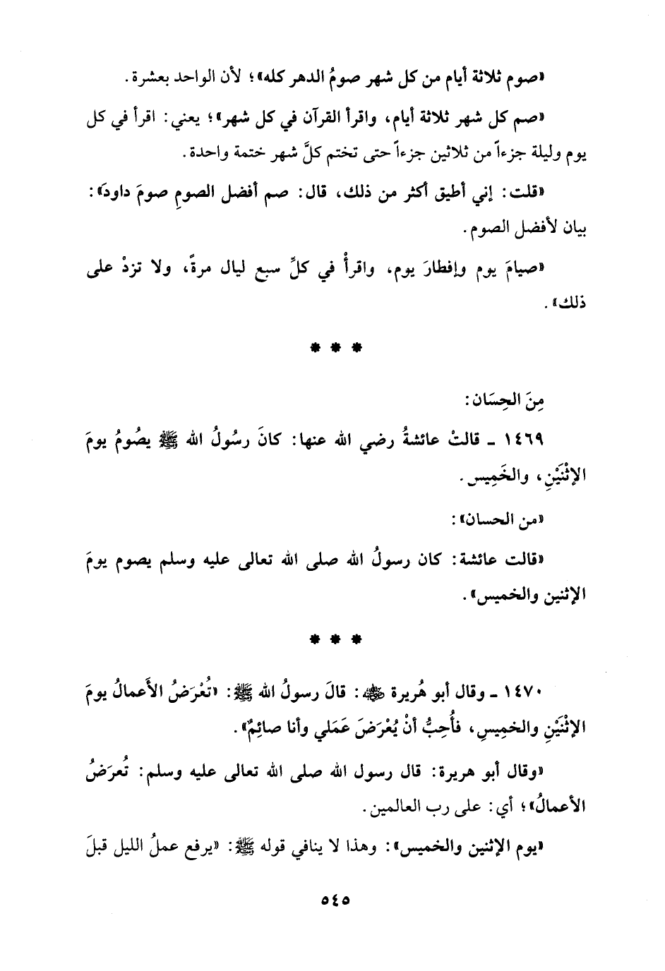 1469 - قالتْ عائشةُ رضي الله عنها: كانَ رسُولُ الله - صلى الله عليه وسلم - يصُومُ يومَ الإثْنَيْنِ، والخَمِيس.