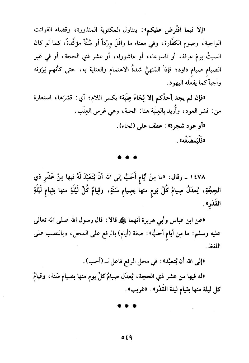 "عن ابن عباس وأبي هريرة أنهما - رضي الله عنهم - قالا: قال رسول الله صلى الله تعالى عليه وسلم: ما مِن أيامٍ أحبُّ": صفة (أيام) بالرفع على المحل، وبالنصب على اللفظ.