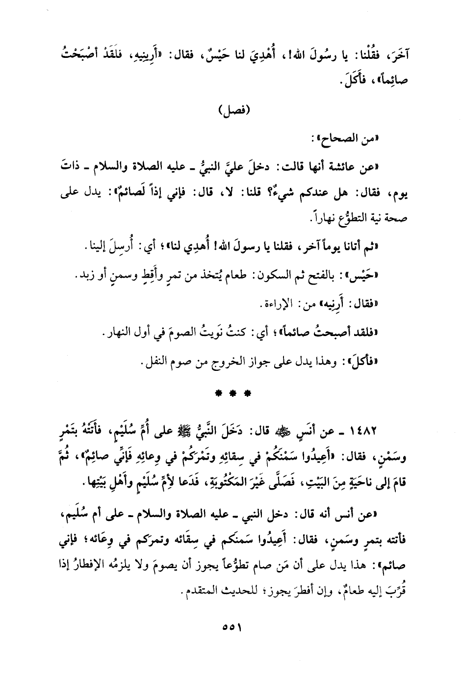 آخَرَ، فقُلْنا: يا رسُولَ الله!، أُهْدِيَ لنا حَيْسٌ، فقال: "أَرِينِيهِ، فَلَقَدْ أصْبَحْتُ صائِمًا"، فَأَكَلَ.